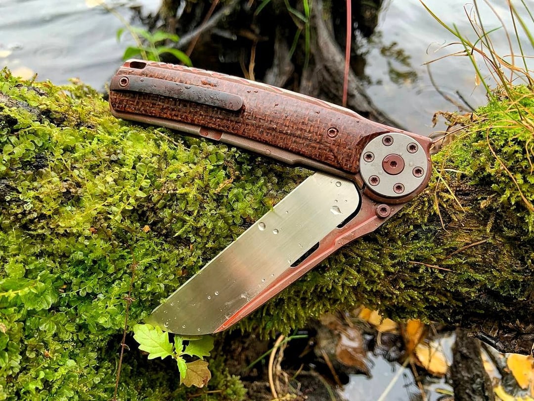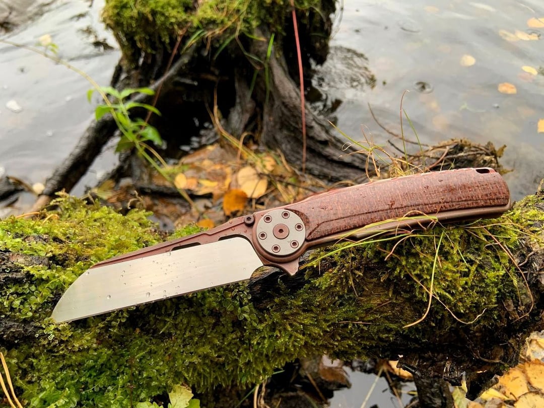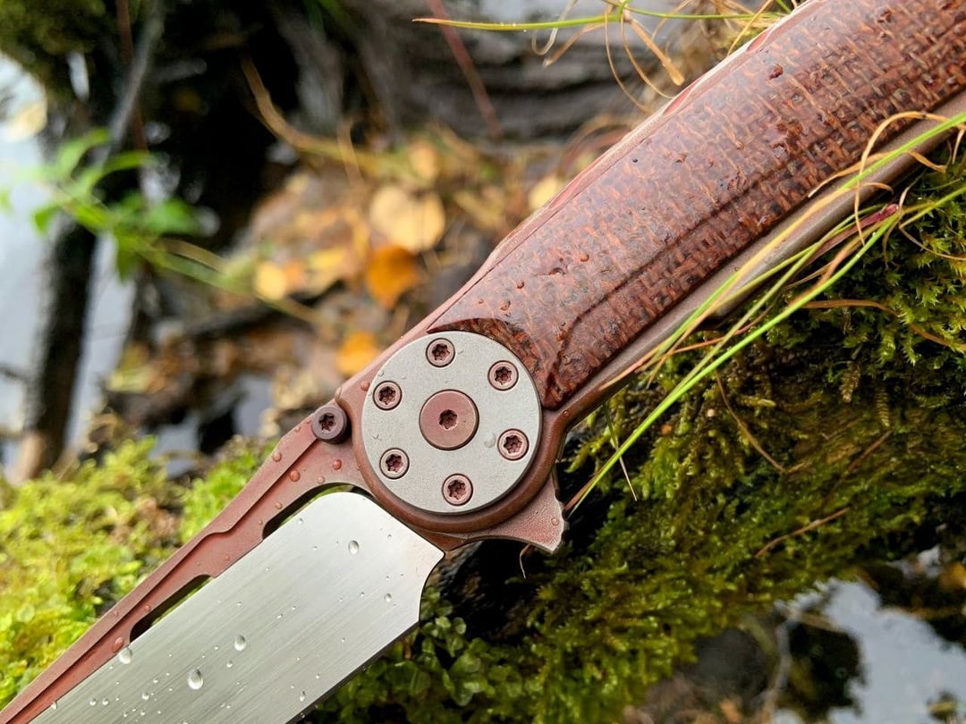 A rather curious knife from Reate – a beefy integral handle with a snap-on blade of m390. The pivot cylinder is quite charismatic, interesting technical decisions on fixing the micarta scales – front one has no visible screws.
