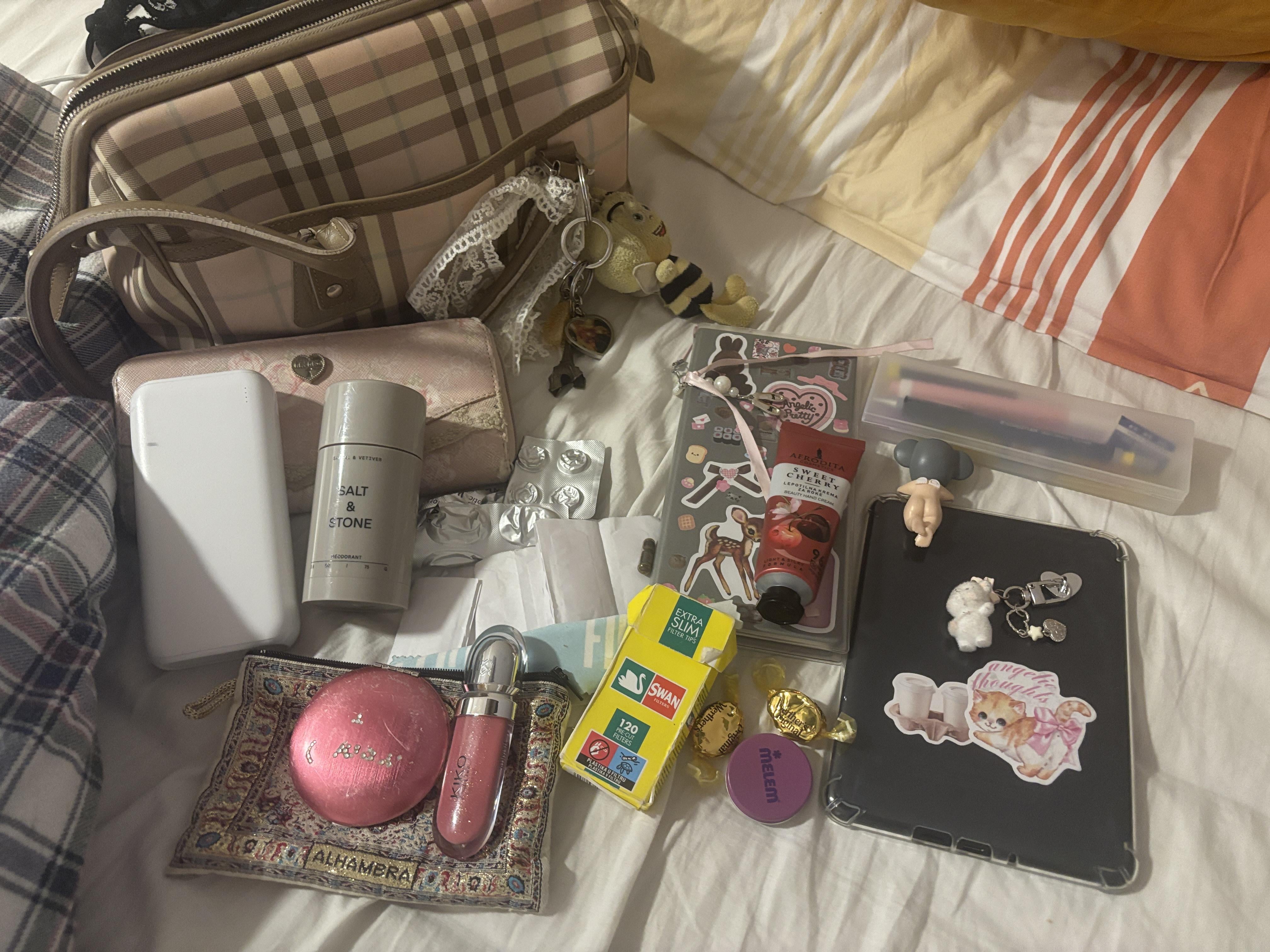 this is what i carry with me on daily basis in my vintage burberry: wallet, salt&stone deodorant my bf bought me for christmas >__<, powerbank, some medicine and plasters, hand cream, lip balm, handkerchief for my glasses, kiko lipgloss w a tiny mirror that's probably older than me, caramel candy, additional filters in case i lose the ones i carry in the pockets of my coat, kindle, hobonichi dupe, pencil case and in the pouch i carry all the lip&skin products i mentioned above