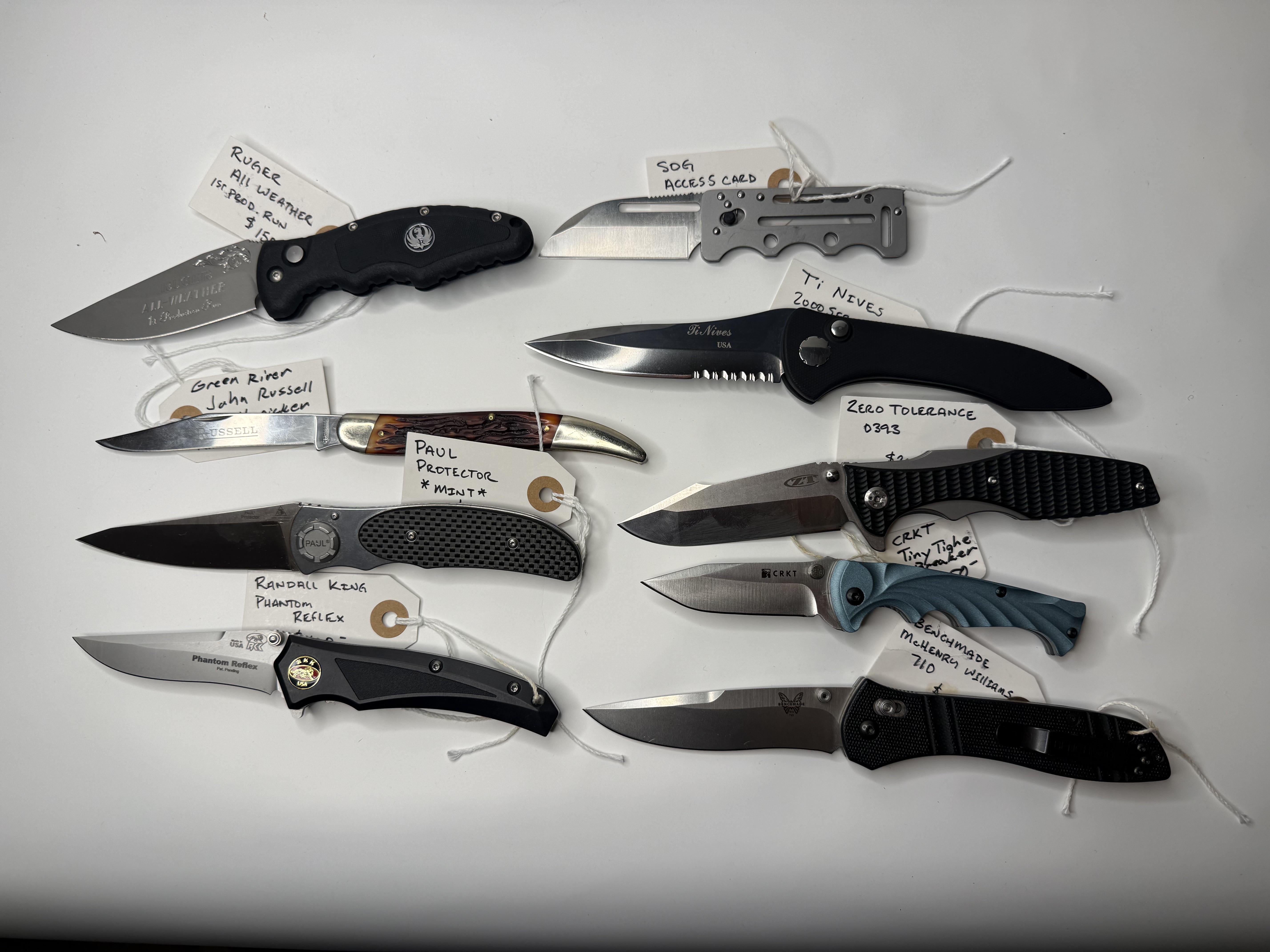 Look them up on Arizona Custom knives. They have a lot of stuff like these. The Randal is worth a fair penny. The ZT would probably fetch $200 plus along with the Benchmade 719. The CRKT is not a budget knife either.