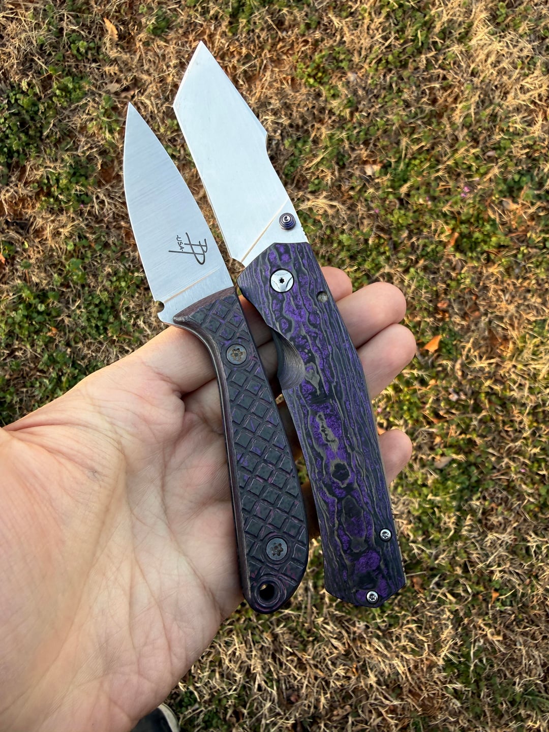 For anyone curious on the specs, it’s a satin Magnacut blade and purple fatcarbon scales. The folding knife on the right is my BM Knives Vector.