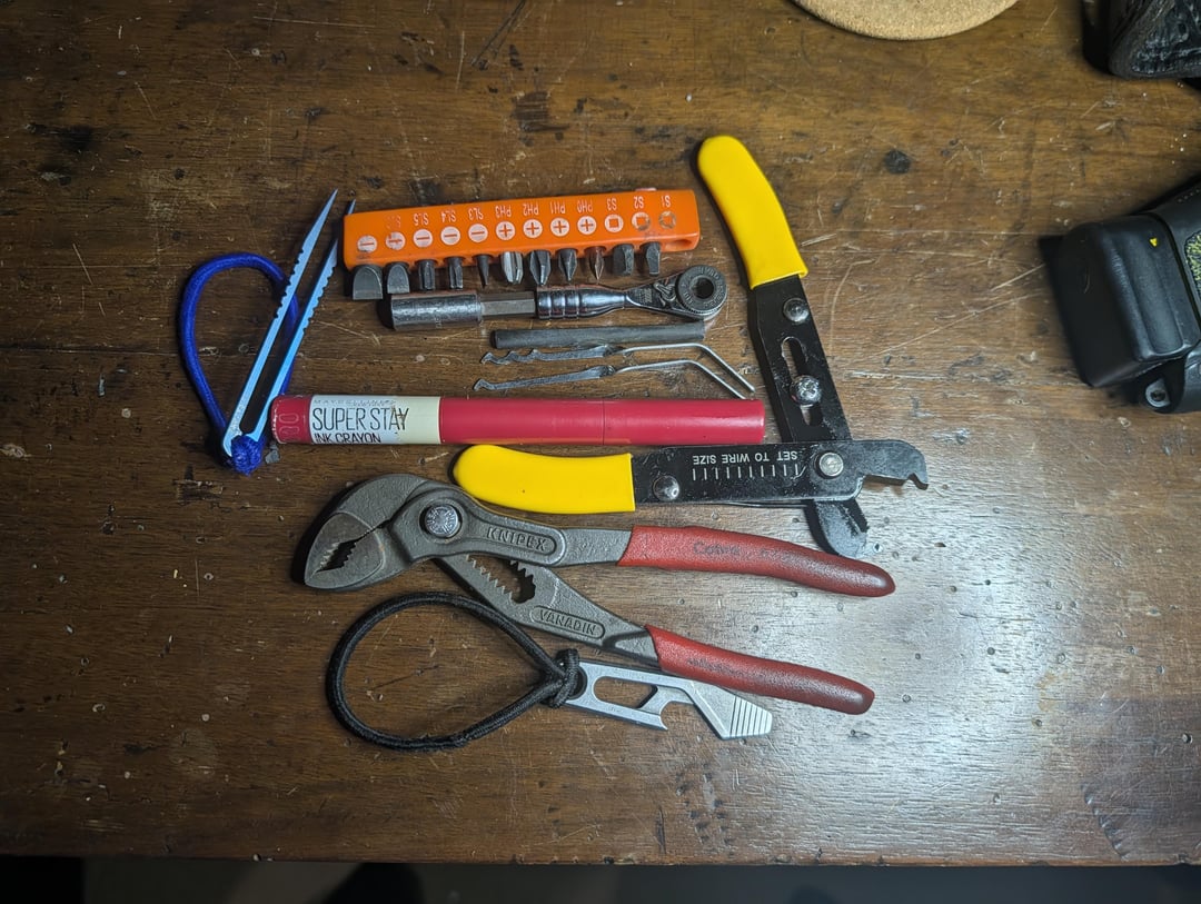 Kershaw bottle opened, it's really a knife saver. Kinipex 6 inch pipe pliers. Wire cutters from Amazon (6 bucks?). Wife's lipstick. LPL lock picks. TIIL #71105 wratchet and a cheap extension. Assortment of 1/4 inch bits that work for men. The pouch is by Gentlestash, again from Amazon. Modified by me.