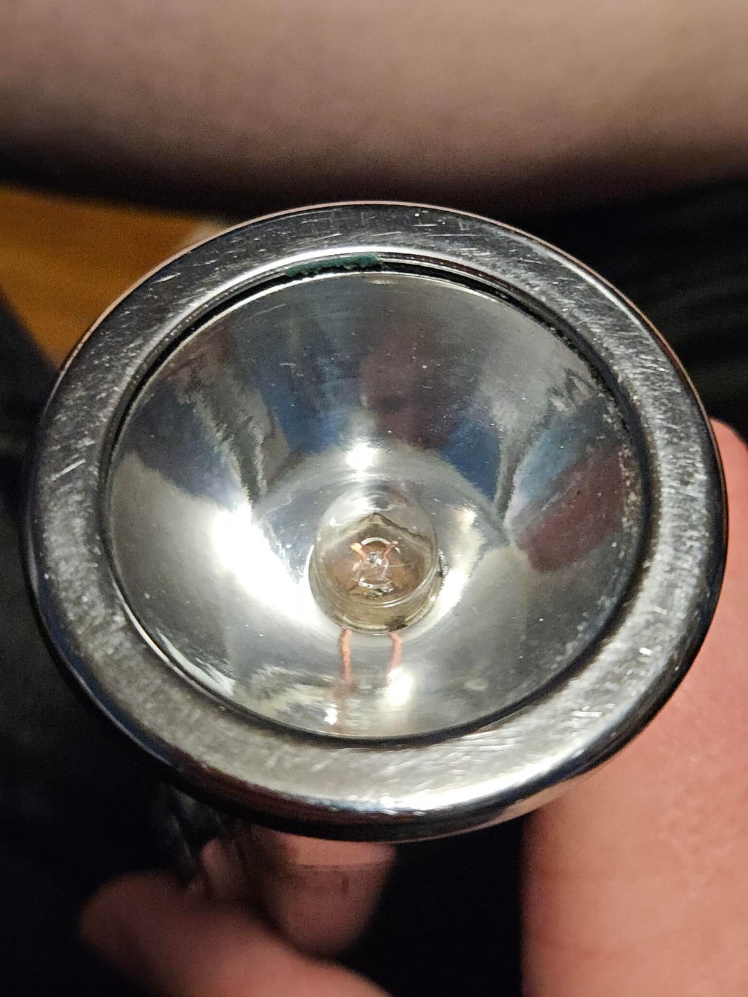 I should note, I've slightly upgraded this light. Instead of the stock 2.4V PR2 bulb, I'm using a 7.2V P13.5S bulb. Additionally, I'm using 6 AA NiMH Eneloops in series, because screw alkaleaks and praise rechargeability. All this to say that, despite this light still being relatively dim, it's quite a bit better than it was with the stock bulb and 2 D cells.