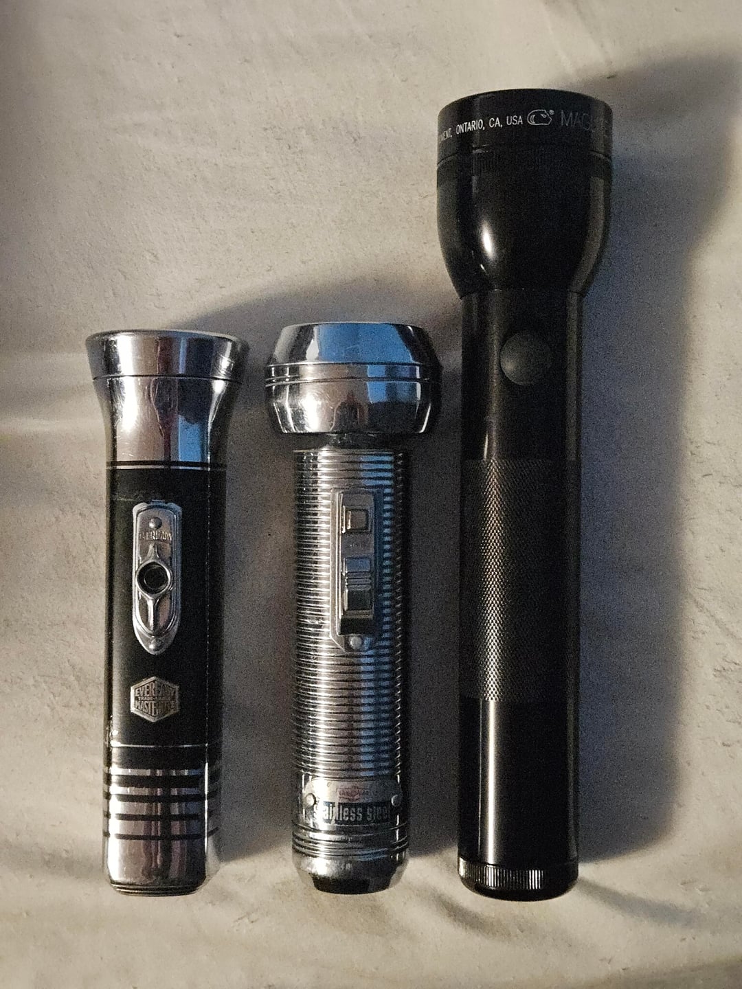 Compared to other old lights I have, this one is really unique. For a 2 D cell light, this thing is relatively compact, it makes the Maglite 2D on image 4 look huge. It's vaguely Zebralight esque where it only opens from one end, the head. The body tube is rounded square shaped, which is quite unusual to me but it works well in the hand. The switch is kinda different, it's a momentary hold the button for on, but you can slide the whole switch forward to keep the light on without you having to keep holding the button down.