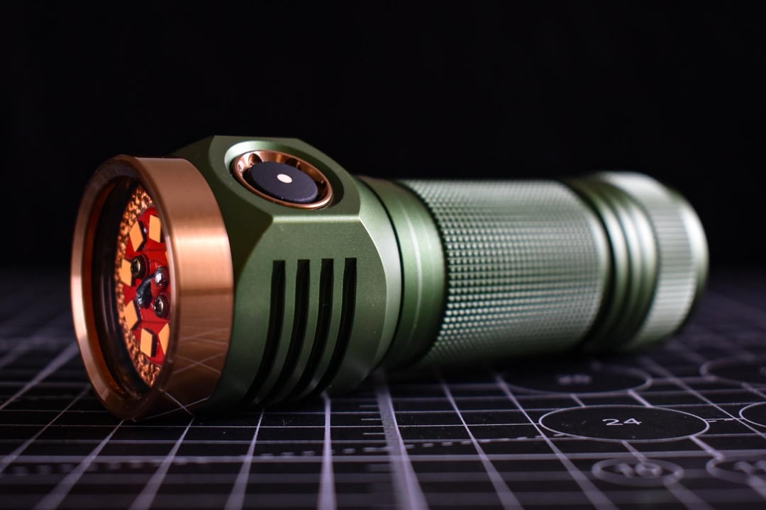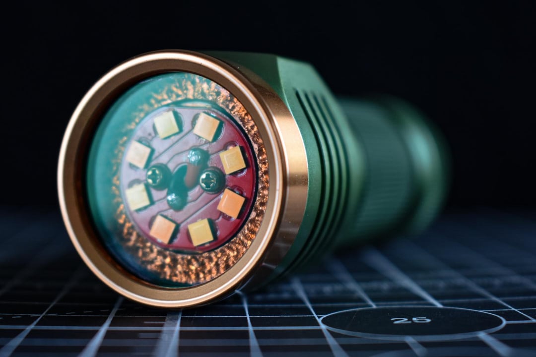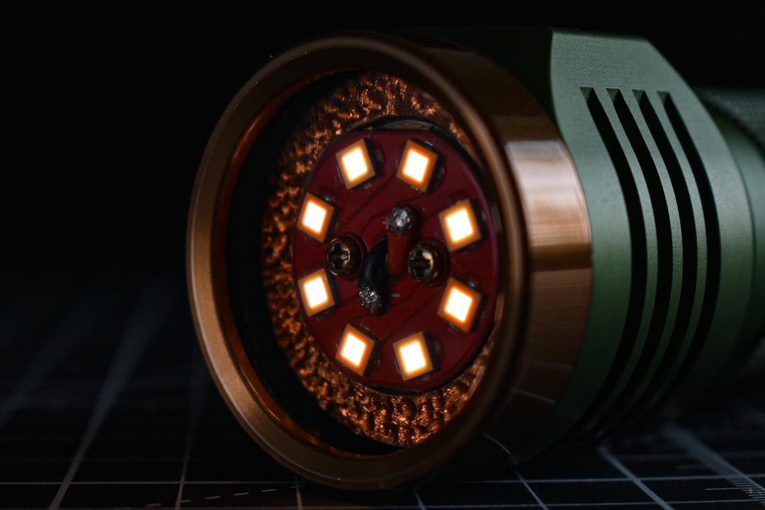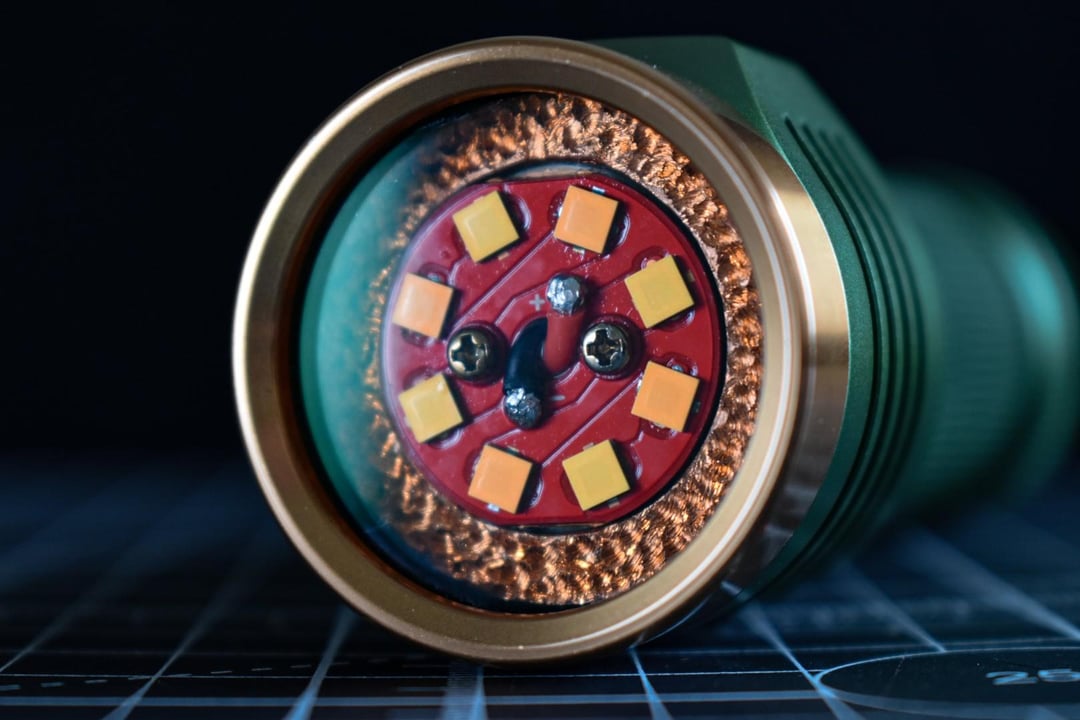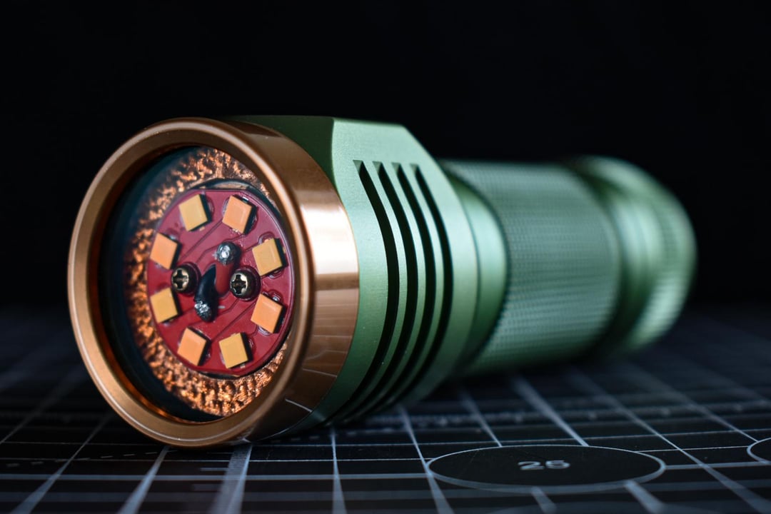 I took inspiration from my D4SV2 SBT90.2 mule build, & decided to house the MCPCB in copper, creating a hybrid heat sink, with the large copper housing becoming an extension of the MCPCB. This housing is secured to the Aluminium spacer with flame colour tempered SS screws. The copper housing with textured copper frame is probably my favourite aspect of this build, & was fun to make. To see it in that gorgeous host is just π€€