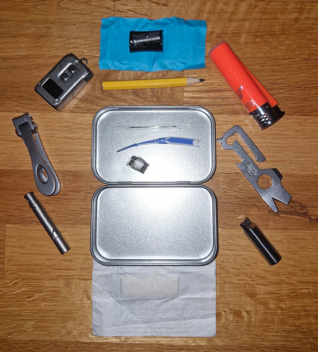 Dans ma boite, j'ai : un sifflet, un coupe-ongle, une lampe de poche, papier, crayon, taille crayon, briquet, gerber mullet, un coalgan et un cylindre qui contient un paracetamol et un antihistaminique.