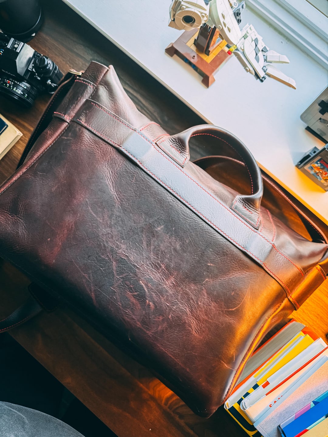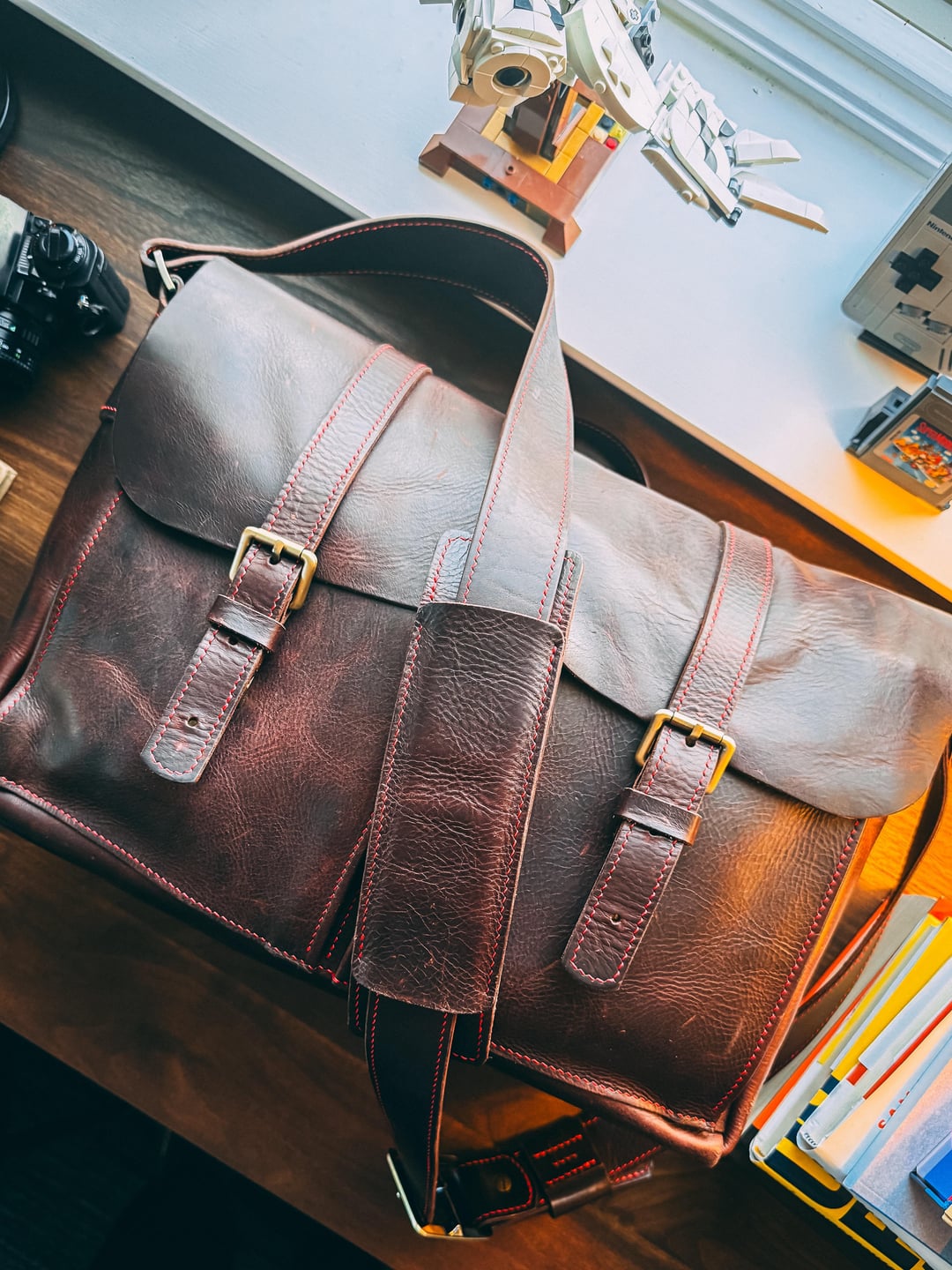 All leather covers are custom and handmade (including the bag!)
