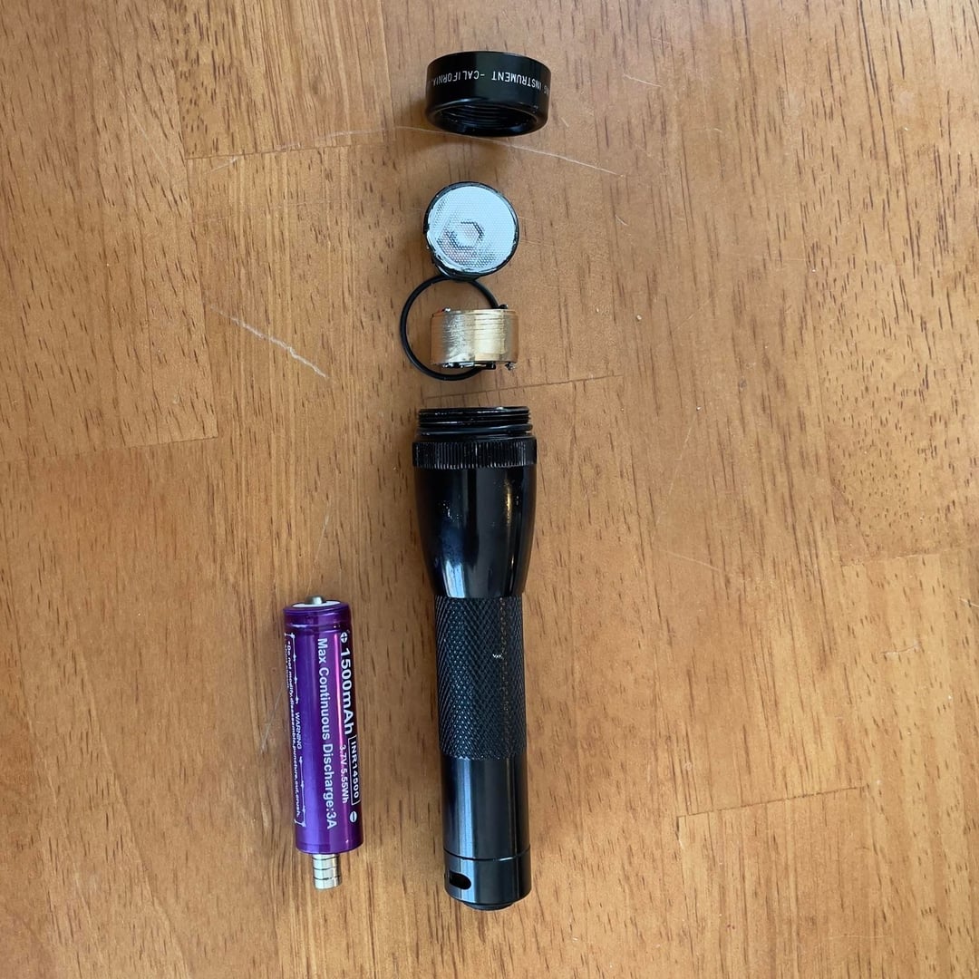 I hacksawed the barrel roughly to where I figured one AA sized cell would reach the driver, gave a little space for safety, and then JB Welded it in place. I’ve seen people shorten Mag barrels by reducing the OD of a section behind the threads and fitting it to a reciprocally reduced ID section of the barrel. Maybe some day I’ll tackle that!