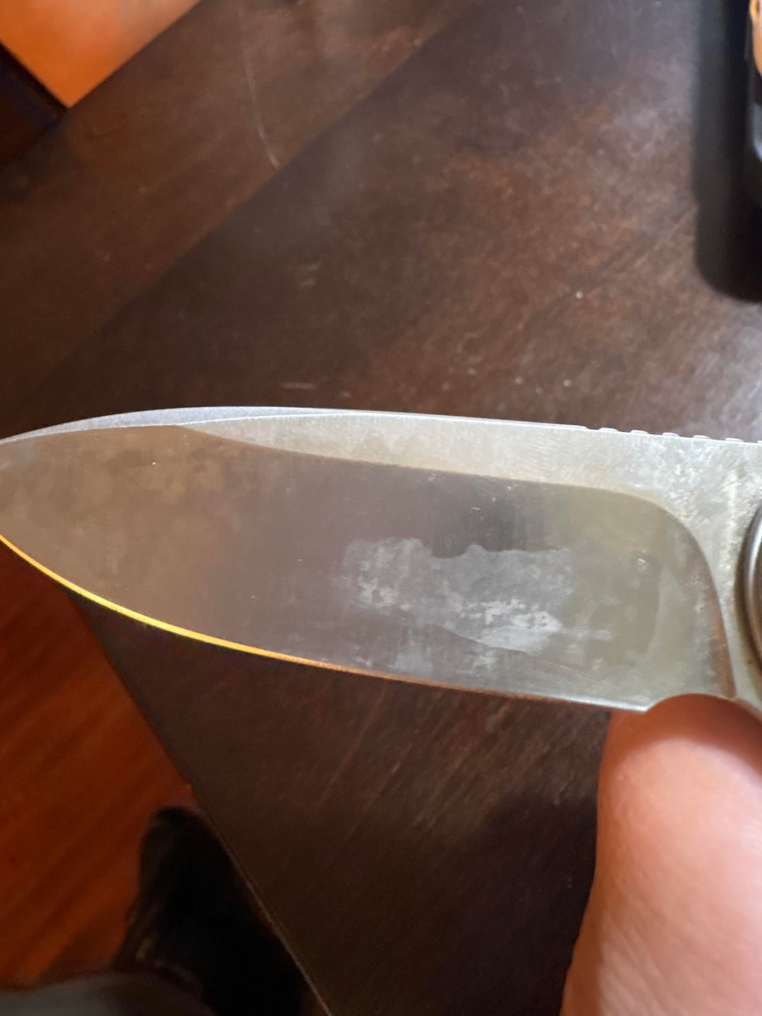Hi! So I’m new in the world of knives and a friend gave me my first pocket knife (that isn’t a $20 swap meet knife). It’s a Civivi brand folder but here’s where I went wrong. I took my nephew fishing and forgot my beater knife so I used my Civivi that day. I put it away and months later found rust on it. I tried using the vinegar technique but must of done something wrong as it left a blotch on the other side of the blade. Rust was removed and what I was left with is pictured below. My local knife repair shop said to use Flitz and it helped a little with the blotch but didn’t remove it… so… did I ruin my knife or is there a way to fix this?