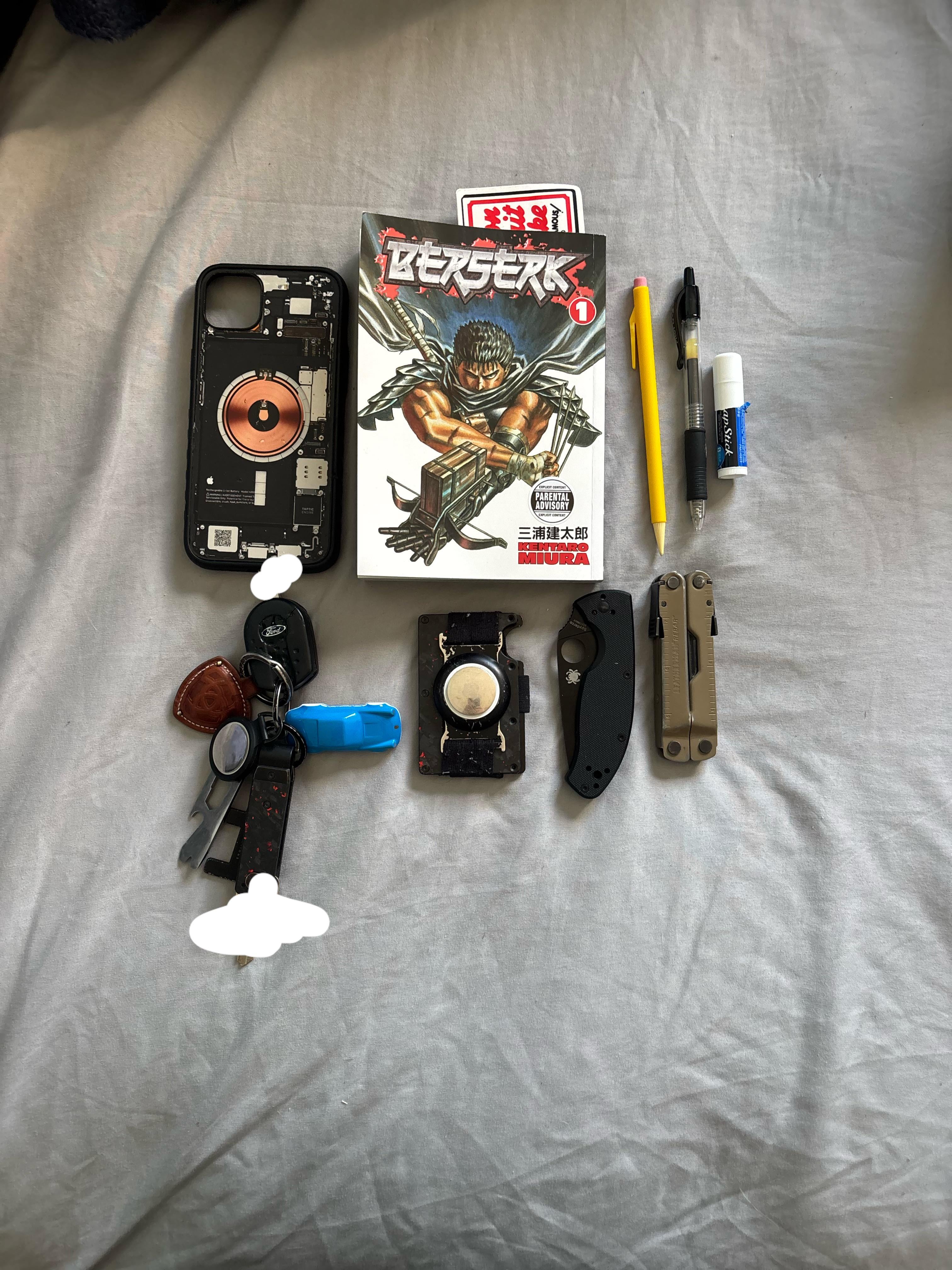 In EDC My EDC February 28, 2026 From top left to bottom right:iphone 15 plus, berserk volume 1, paper mate sharpwriter, pilot g-2, chapstick moisturizer, truck keys, ridge wallet, spyderco tenacious, leatherman rebarby Calm_Perspective6199 EDC Prev Post Glow in the dark flashlights. February 28, 2026 Next Post Stuff that’s in my pockets lately February 28, 2026 Related Posts Saturday Stuff… February 28, 2026 The good ole Brass EDC February 28, 2026 Aluminum honeycomb worry coins February 28, 2026 1 Comment AutoModerator 5 hours ago Thank you for posting to r/EDC! Include a detailed item list (make/model) within **1 hour** of submission. Lists can go in the title, a comment, or the image. Posts without lists will be removed. If you have already provided a list, not further action is needed, thanks | [FAQ](https://www.reddit.com/r/EDC/wiki/faq)*I am a bot, and this action was performed automatically. Please [contact the moderators of this subreddit](/message/compose/?to=/r/EDC) if you have any questions or concerns.*Write A CommentYou must be logged in to post a comment.