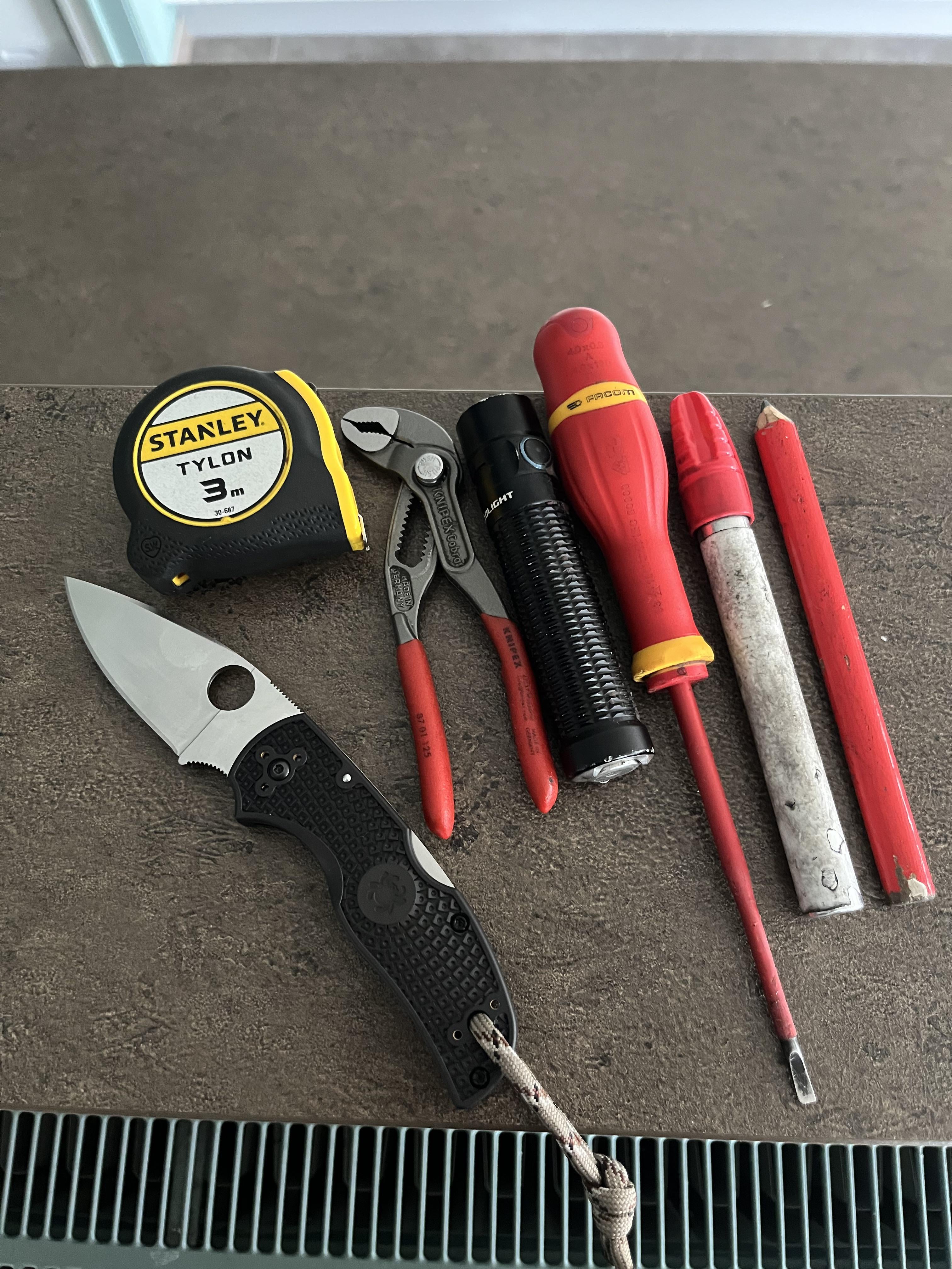 In EDC Work carry February 28, 2026 Spyderco native 5 salt (dyed dark blue)Stanley 3M tape measure Knipex cobra pliersOlight warrior miniFacom screwdriverPaint markerPencilby Healthy-Vegetable424 EDC Prev Post My EDC-backpack February 28, 2026 Next Post What part of this Kosen flashlight is from Malkoff? February 28, 2026 Related Posts EDC DUMP February 28, 2026 Todays work carry February 28, 2026 40M Dad EDC February 28, 2026 1 Comment AutoModerator 3 hours ago Thank you for posting to r/EDC! Include a detailed item list (make/model) within **1 hour** of submission. Lists can go in the title, a comment, or the image. Posts without lists will be removed. If you have already provided a list, not further action is needed, thanks | [FAQ](https://www.reddit.com/r/EDC/wiki/faq)*I am a bot, and this action was performed automatically. Please [contact the moderators of this subreddit](/message/compose/?to=/r/EDC) if you have any questions or concerns.*Write A CommentYou must be logged in to post a comment.