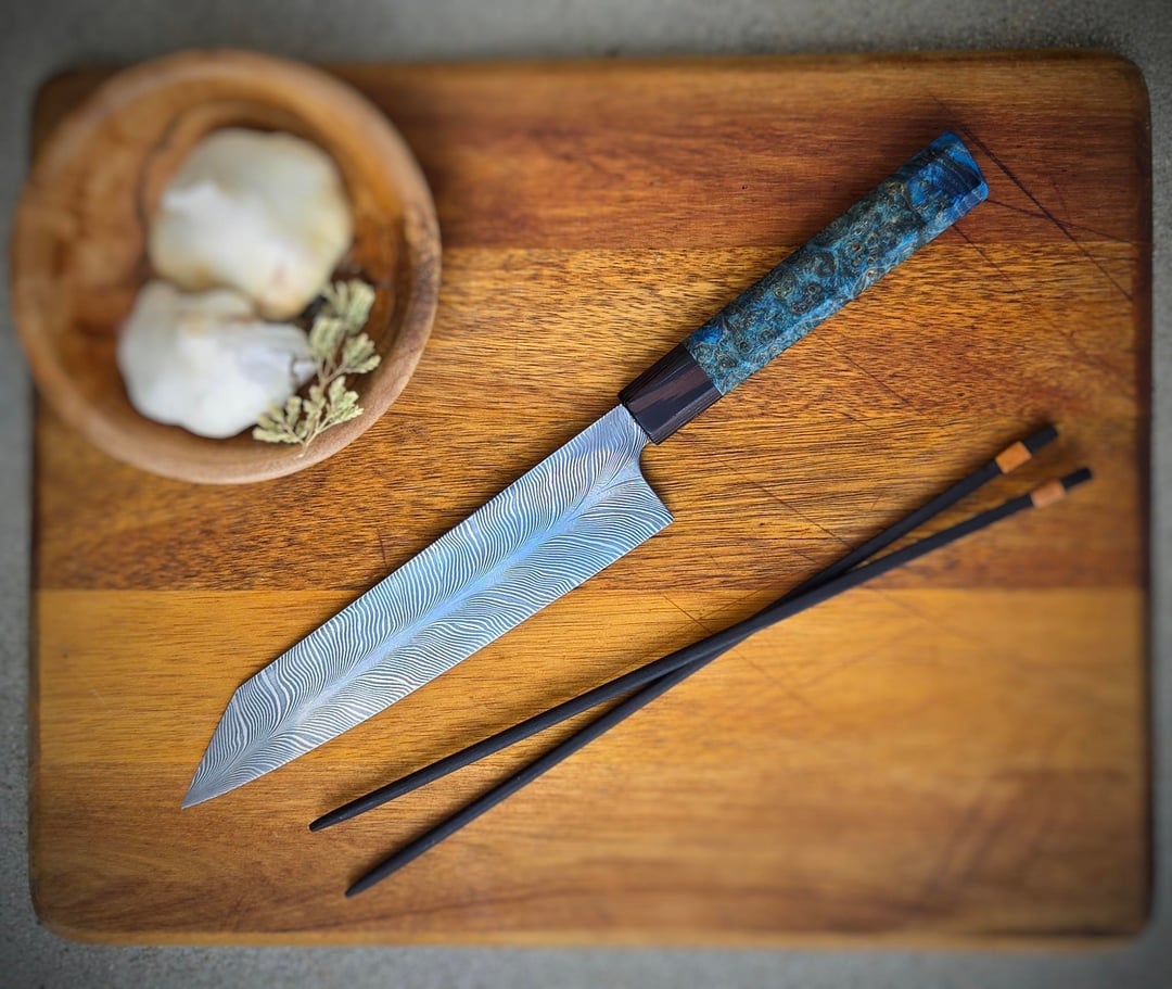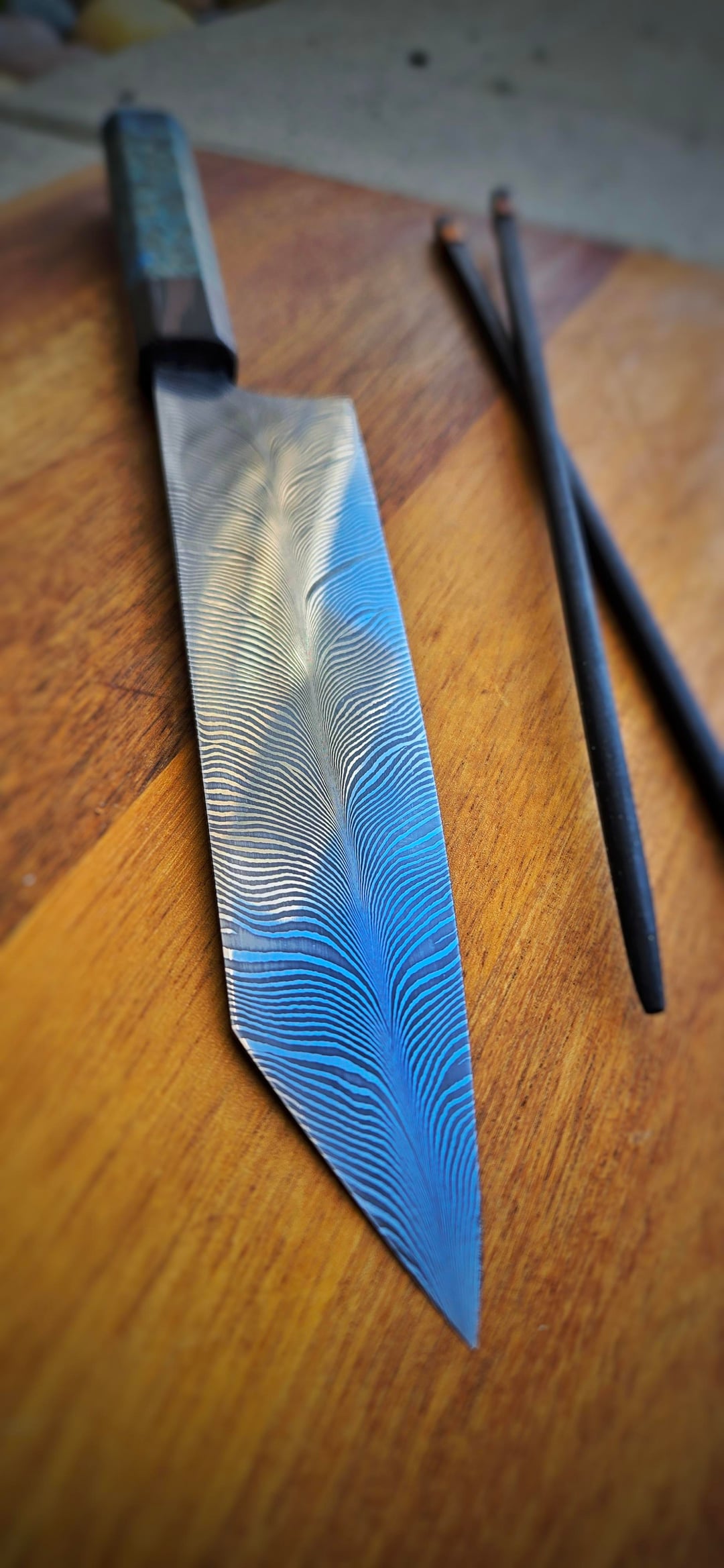 Handle is probably the craziest burl I've worked with. Ash stabilized in blue resin paired with wenge. Calling it the starry night