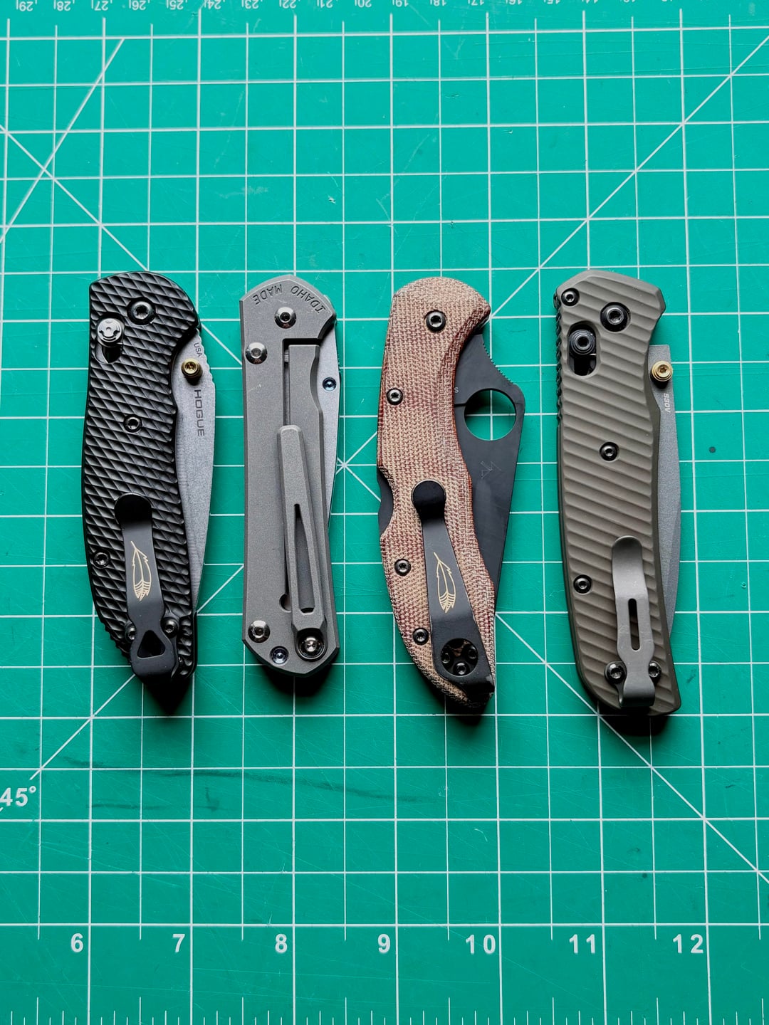 Unamuzed-Toast 2 hours ago * Ritter Hogue Mini RSK w. OG Goat scales & LynchNW clip * CRK Small Sebenza 31 * Spyderco Delica w. Flytanium scales & LynchNW clip * Benchmade Bugout w. AWT scales