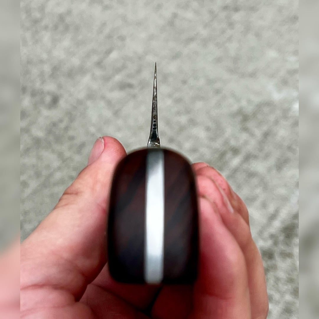 Finally made the wifey a kitchen knife. Forged this one out of Pops ProCut with a distressed mustard patina and is wearing some desert ironwood with peened brass pins. The stand is olive wood with a forged mild steel holder. She cuts 100% better than a store bought knife, especially with the convex grind it has.