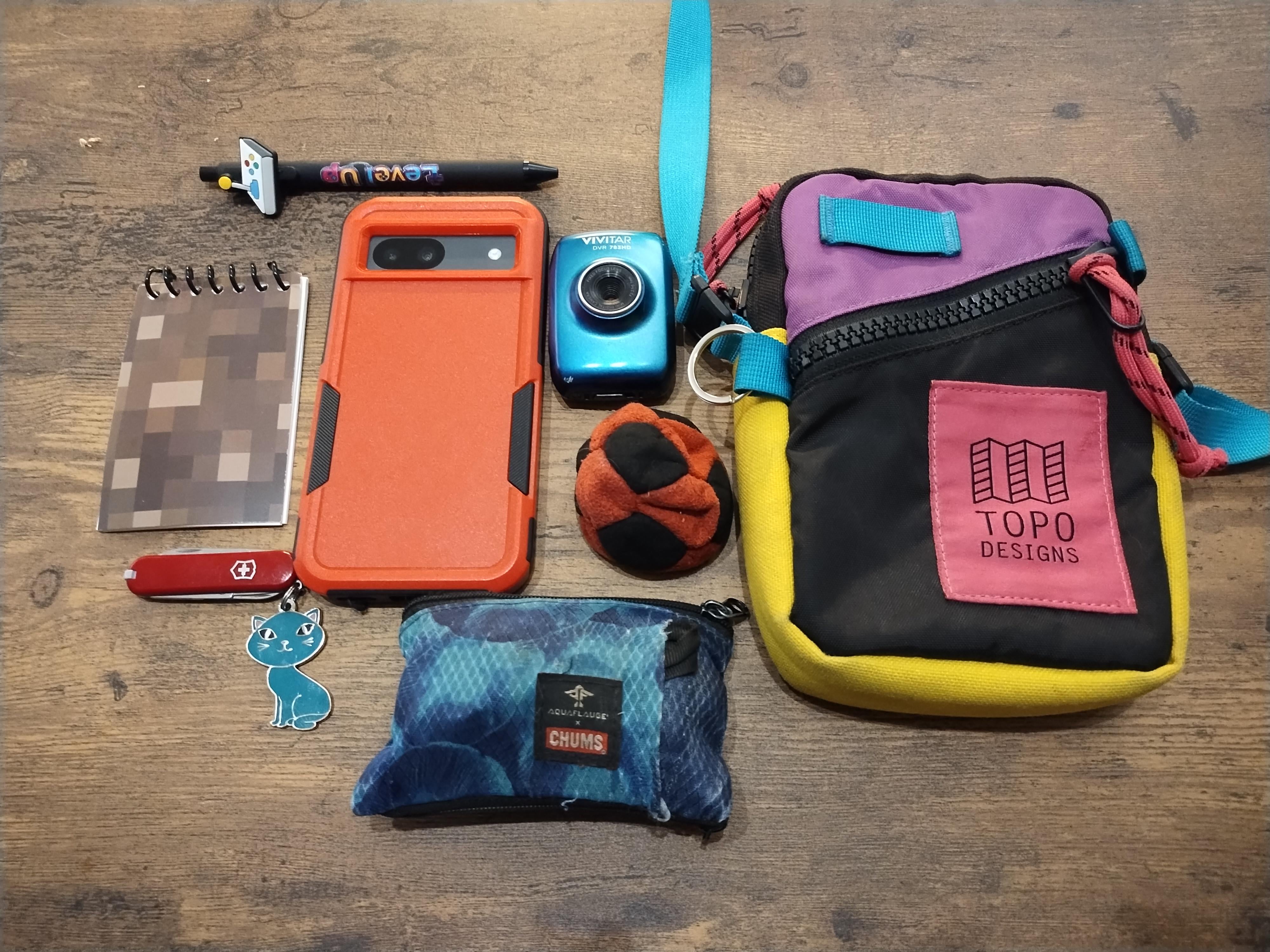 My son saw me looking at this sub and wanted to post his carry. Minecraft notepad, videogame themed pen, hacky sack (stolen from me), my old chums wallet (packed with an insane amount of lose change), Victorinox Swiss Army Classic SD Pocket Knife, Google Pixel, Vivitar DVR 783HD, Topo designs shoulder bag