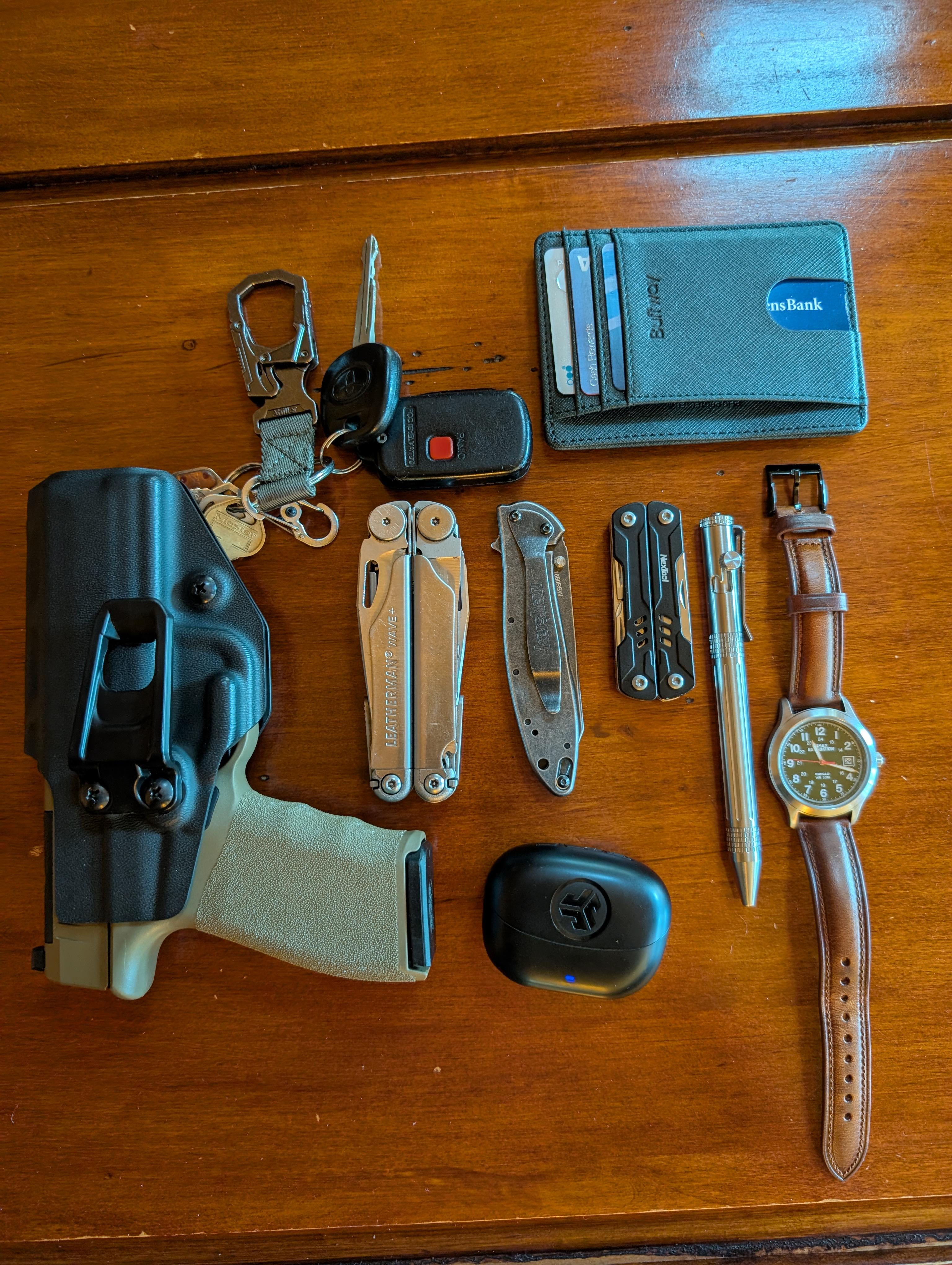 Hellcat pro 9mm, Leatherman wave+, Kershaw random leek, jlab earbuds, Nextool mini sailor s11, Smootherpro bolt action pen, Timex expedition w/ Gomvadr leather bracelet, Buffway slim minimalist wallet & Ahiller double lock carabineer