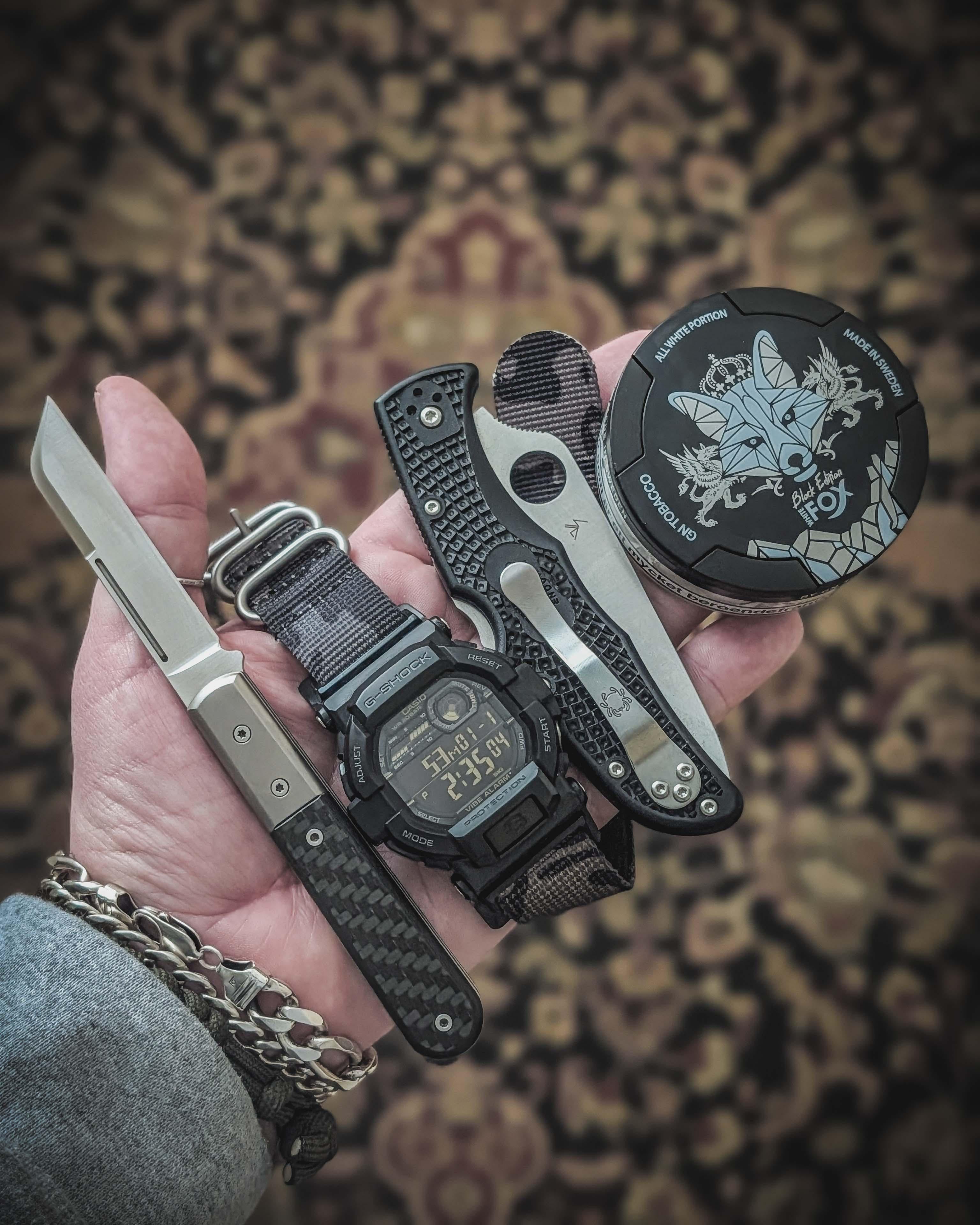 Lionsteel Dom Sheepsfoot in M390, Modded G-Shock GD-350, Spyderco saber ground Endura, White Fox Black Edition 22.5mg pouches. 🖤
