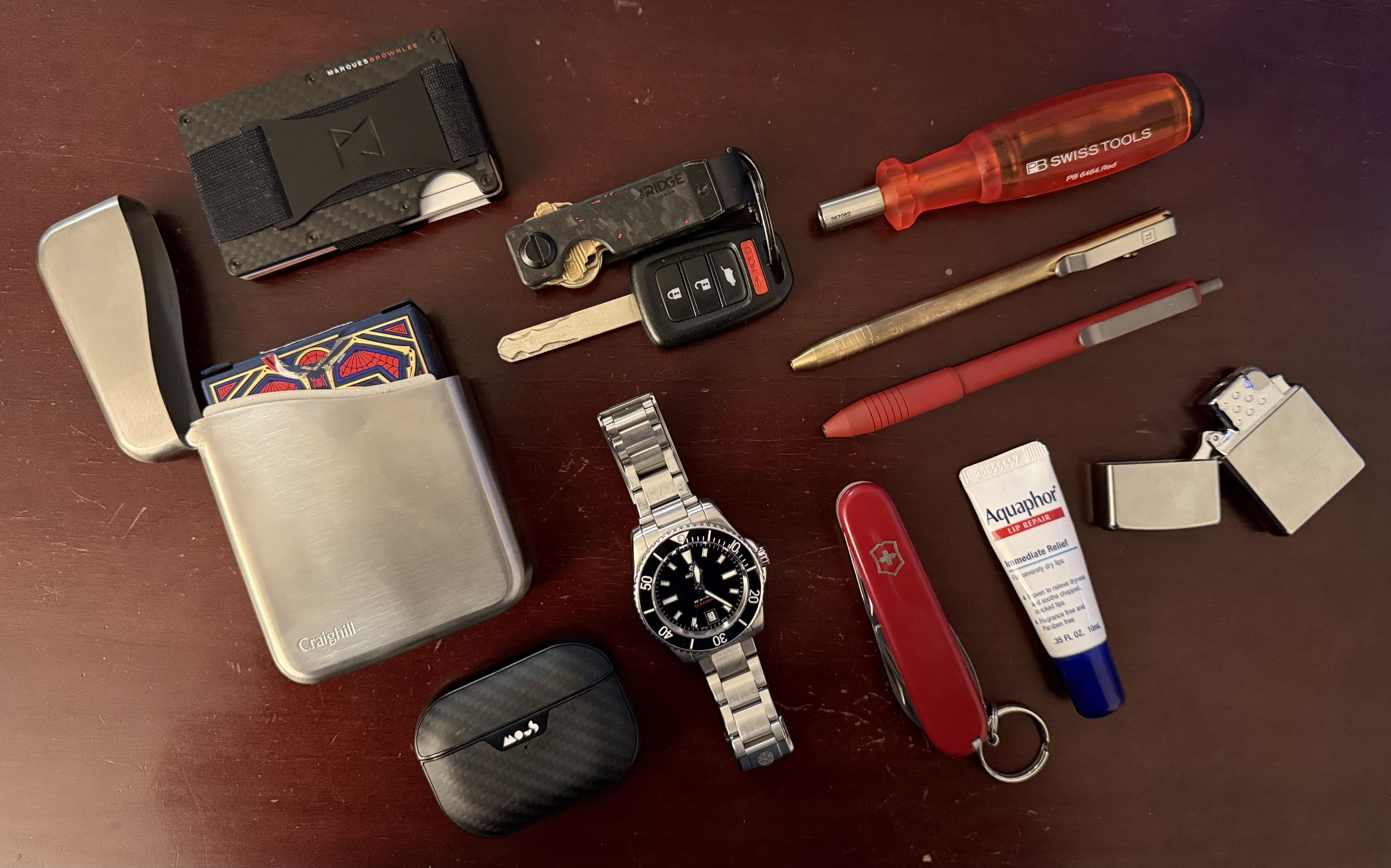 I've been trying to work out a proper EDC that works best for my lifestyle and I feel pretty dang satisfied to have put this together. I carry all these in a Fjallraven High Coast Shoulder Pack that I use as a belt pouch, except for: the keys which go in my left pocket, the unpictured iPhone 16 Pro Max in the right pocket, the playing cards and air pods which are in my backpack (Fjallraven Raven 28) that I carry daily.