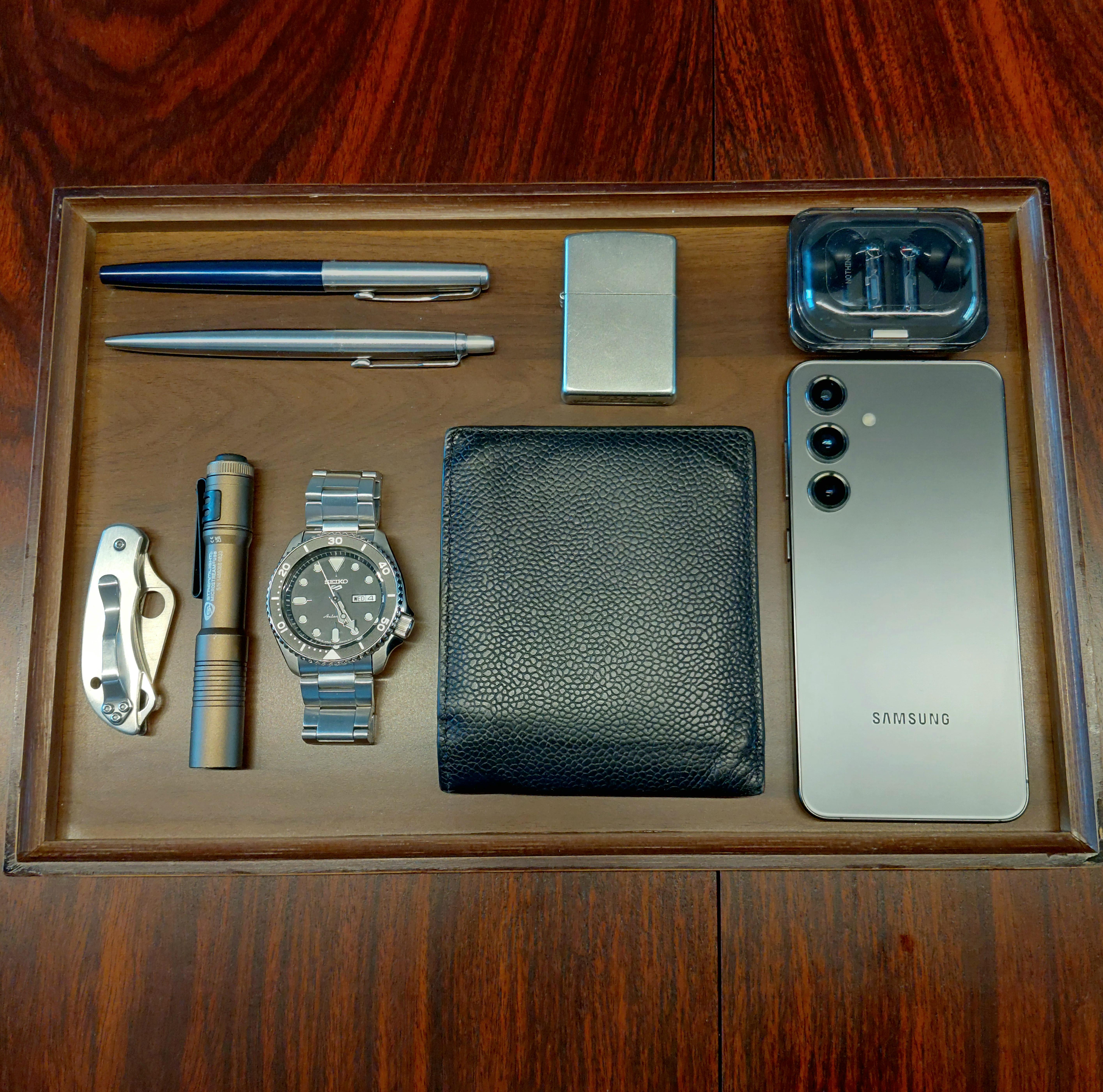 In EDC Daily EDC March 4, 2026 -Parker Jotter Fountain Pen Blue-Parker Jotter Ballpoint pen-Spyderco Bug Stainless -Streamlight 66608-Seiko SRPD51-Zippo lighter-Thom Browne wallet-NothingEar (a) earbuds-Samsung S23by Eullee EDC Prev Post Jury rigged lantern attachment from a candy container. March 4, 2026 Next Post Shirogorov Quantum TKM ZDI MRBS Teal Magnetic March 4, 2026 Related Posts Kershaw went clean with the Eridium March 4, 2026 Male- Mid 30s EDC March 4, 2026 I love this knife. Hard not to carry it. March 4, 2026 1 Comment AutoModerator 2 hours ago Thank you for posting to r/EDC! Include a detailed item list (make/model) within **1 hour** of submission. Lists can go in the title, a comment, or the image. Posts without lists will be removed. If you have already provided a list, not further action is needed, thanks | [FAQ](https://www.reddit.com/r/EDC/wiki/faq)*I am a bot, and this action was performed automatically. Please [contact the moderators of this subreddit](/message/compose/?to=/r/EDC) if you have any questions or concerns.*Write A CommentYou must be logged in to post a comment.