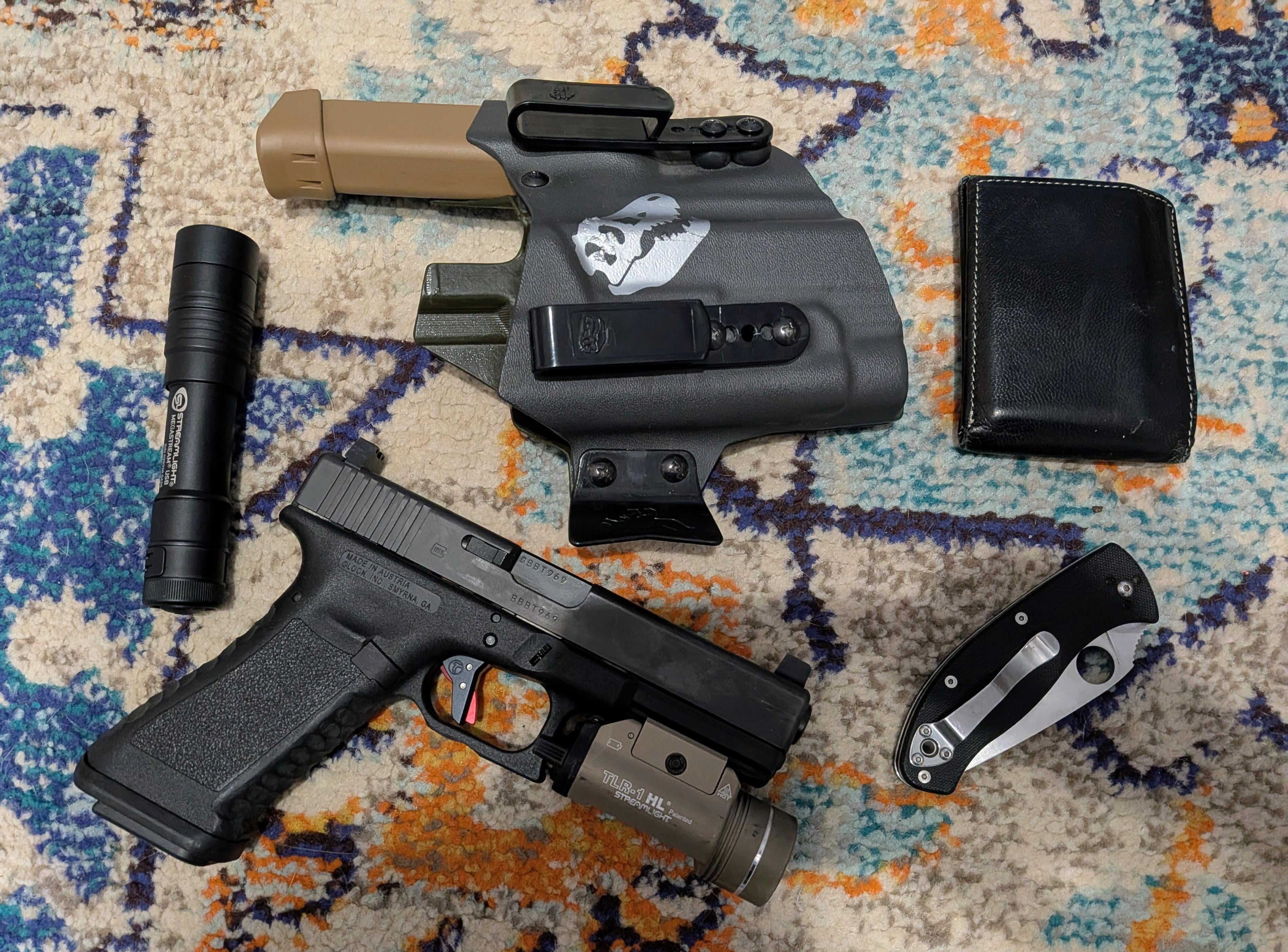 Glock 17.3 w/TLR1 HL in a T.REX ARMS Sidecar holster, Spyderco Tenacious, Streamlight Megastream, Wallet, Non Pictured: Pixel 10 and keys