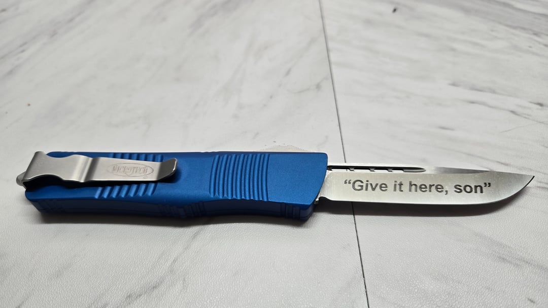 Got my little brother a microtech and had it engraved. Baby shower is today and daddy will at least get one for him. Manually sharpened and 3d printed him a case.
