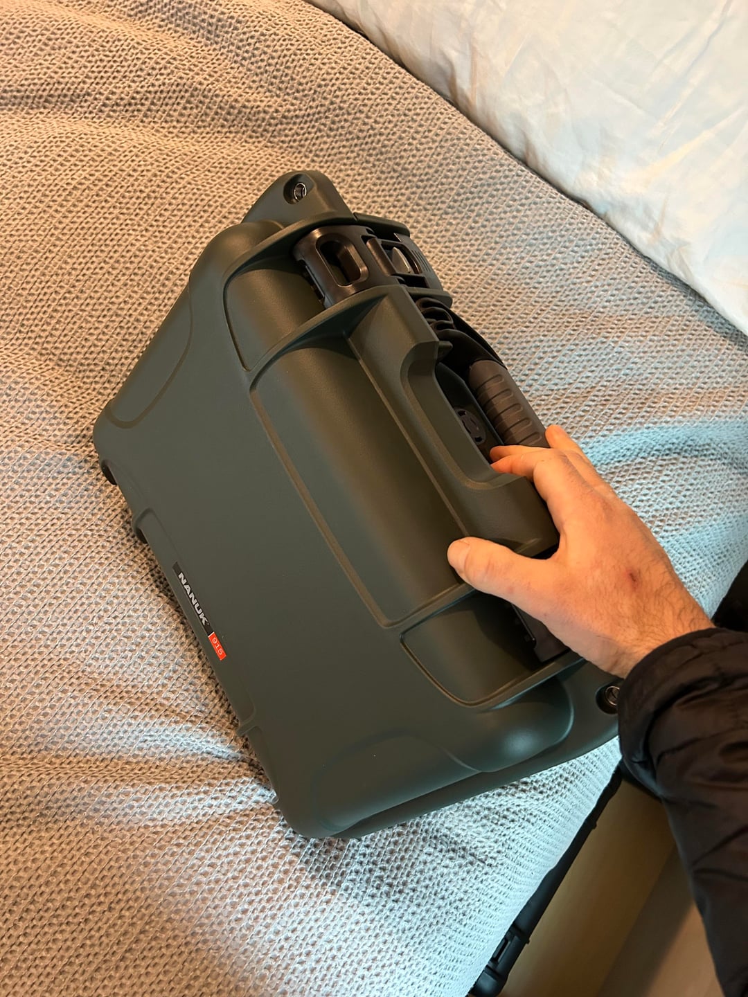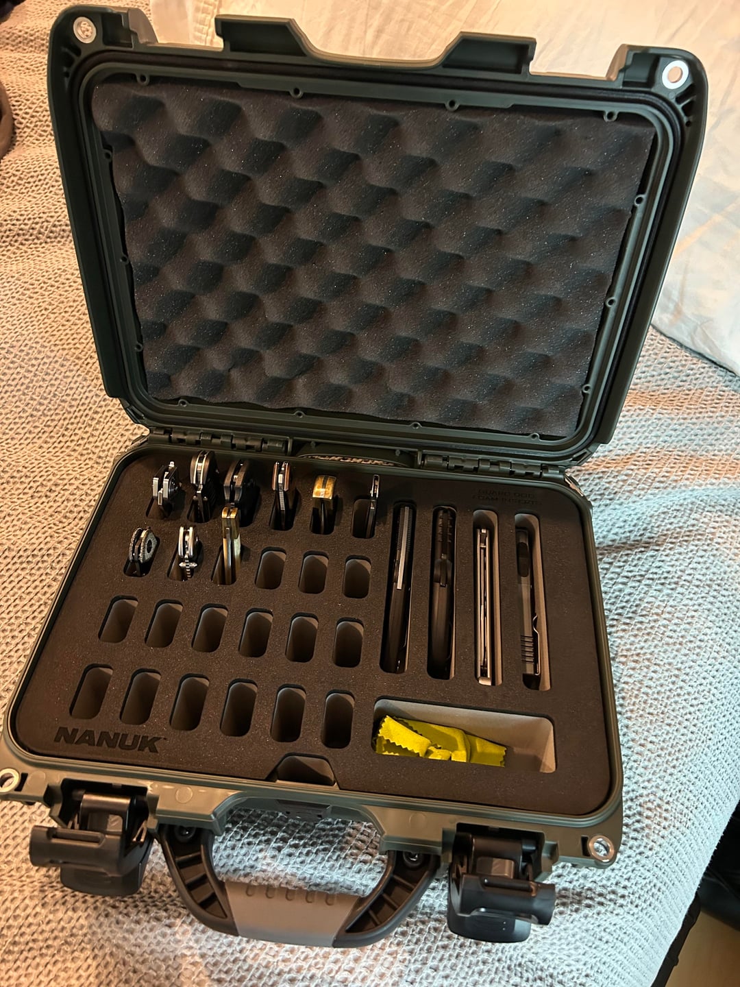 I was on a quest for a lockable case to take some of my larger 6 inchish knives. Could not find a case deep enough to take a full 6 inches (100 percent aware of what I am writing 😂), so I found one that can have them in two directions. The Kershaw Lucha just fits. Just. It is kinda bigger than I expected and silly enough I was unaware the same model I already had for photo gear (black one in photo).