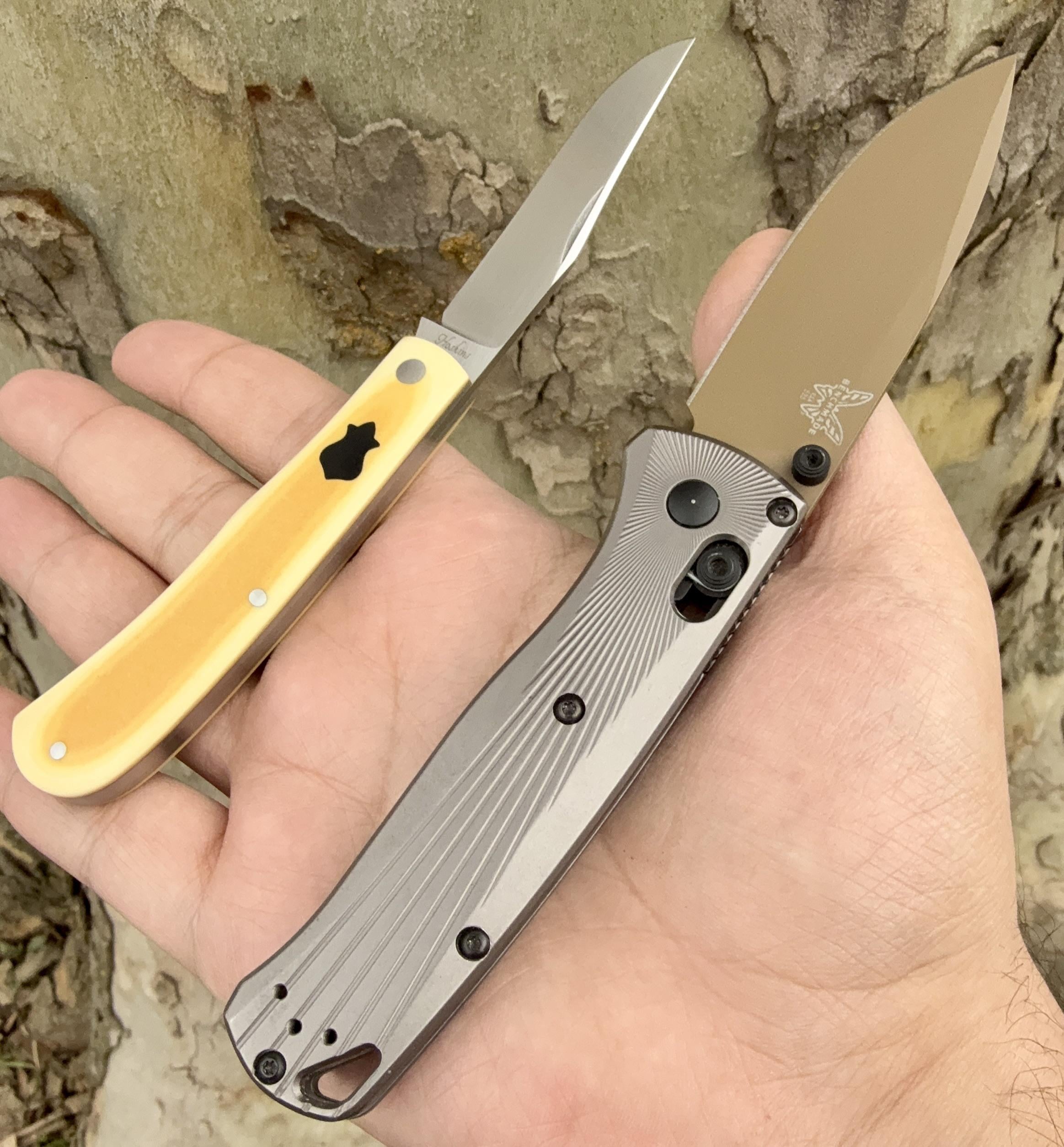 **Hoskin Front Pocket Westinghouse Antique Ivorite Micarta and a Bugout that I swapped the cool starburst scales to (acquired the scales).**