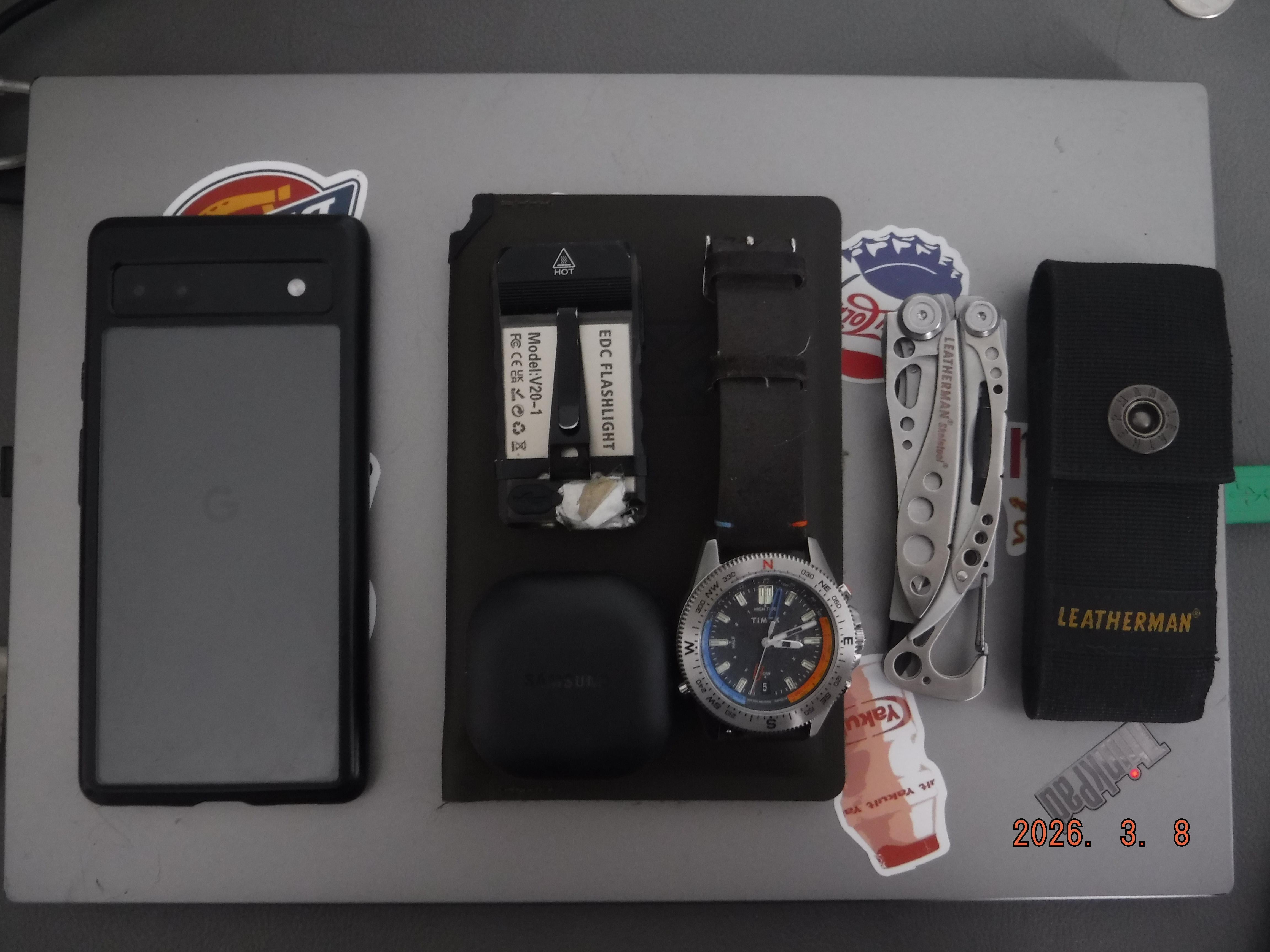 In EDC Pocket dump March 8, 2026 My edc, leather man skeletool, boruit flashlight, galaxy buds 2 pro, Timex tide temp compass watch, rite in the rain horizon wallet and pixel 6a.by BloodshedRedit EDC Prev Post Sunday pocket dump. Finally some nice temperatures outside. March 8, 2026 Next Post Copper 🦎 March 8, 2026 Related Posts Remette RT-Peregrine Falcon , custom Zippo and damn good cigar. March 13, 2026 Theatre Technical Manager/folk musician M39 (Irish based in Helsinki) March 13, 2026 Rate my homemade lanyard March 13, 2026 1 Comment AutoModerator 5 days ago Thank you for posting to r/EDC! Include a detailed item list (make/model) within **1 hour** of submission. Lists can go in the title, a comment, or the image. Posts without lists will be removed. If you have already provided a list, not further action is needed, thanks | [FAQ](https://www.reddit.com/r/EDC/wiki/faq)*I am a bot, and this action was performed automatically. Please [contact the moderators of this subreddit](/message/compose/?to=/r/EDC) if you have any questions or concerns.*Write A CommentYou must be logged in to post a comment.