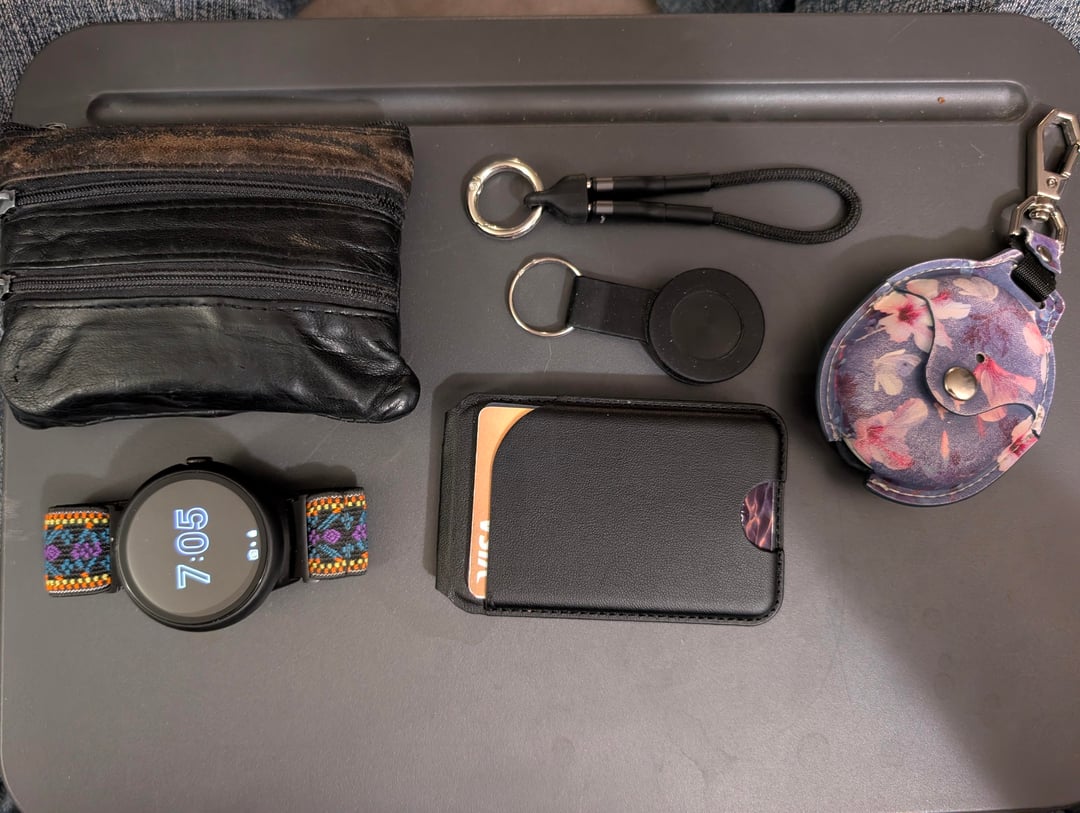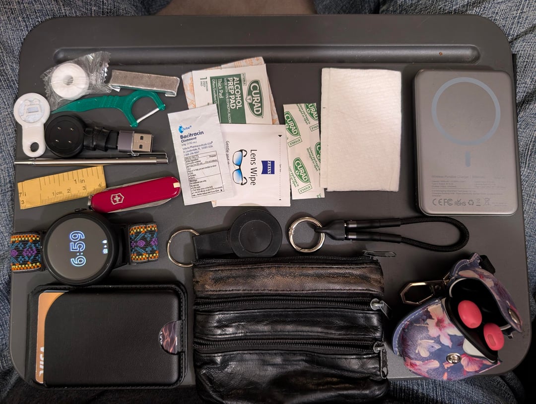 The watch is a Pixel 3. The buds are Pixel 2. The charger is a 5000mah white label that is magsafe to go with my phone. The little puck charges my watch and it has a m/m usb-c adapter plugged into it and a usb-c to USB adapter plugged into that. The Victorinox is a Standard, though it is about to be upgraded to a Rambler. I have a small Zebra pen. The bandages are antibac, the little bandage is a butterfly, a little pouch of bacitracin, a alcohol prep pad and a lens cleaning wipe are my mini first aid. I am big Aldi shopper so having a backup cart key is a must. Single mint and gum for dry mouth. Floss pick for hygiene. I keep a little paper measuring tape from a sewing kit as I am always needing to size something and I had a cloth one, but it added to much bulk. The white rectangle is just a folded up paper towel and that is probably the most used thing in my EDC as I use it to clean my hands and blow my nose (not with the same piece of it!). Not shown is a tiny pill baggy that usually has my pain cocktail of 1g of acetaminophen and 500mg of ibuprofen, a tums, a pepto, and an antihistamine each wrapped in a little foil.