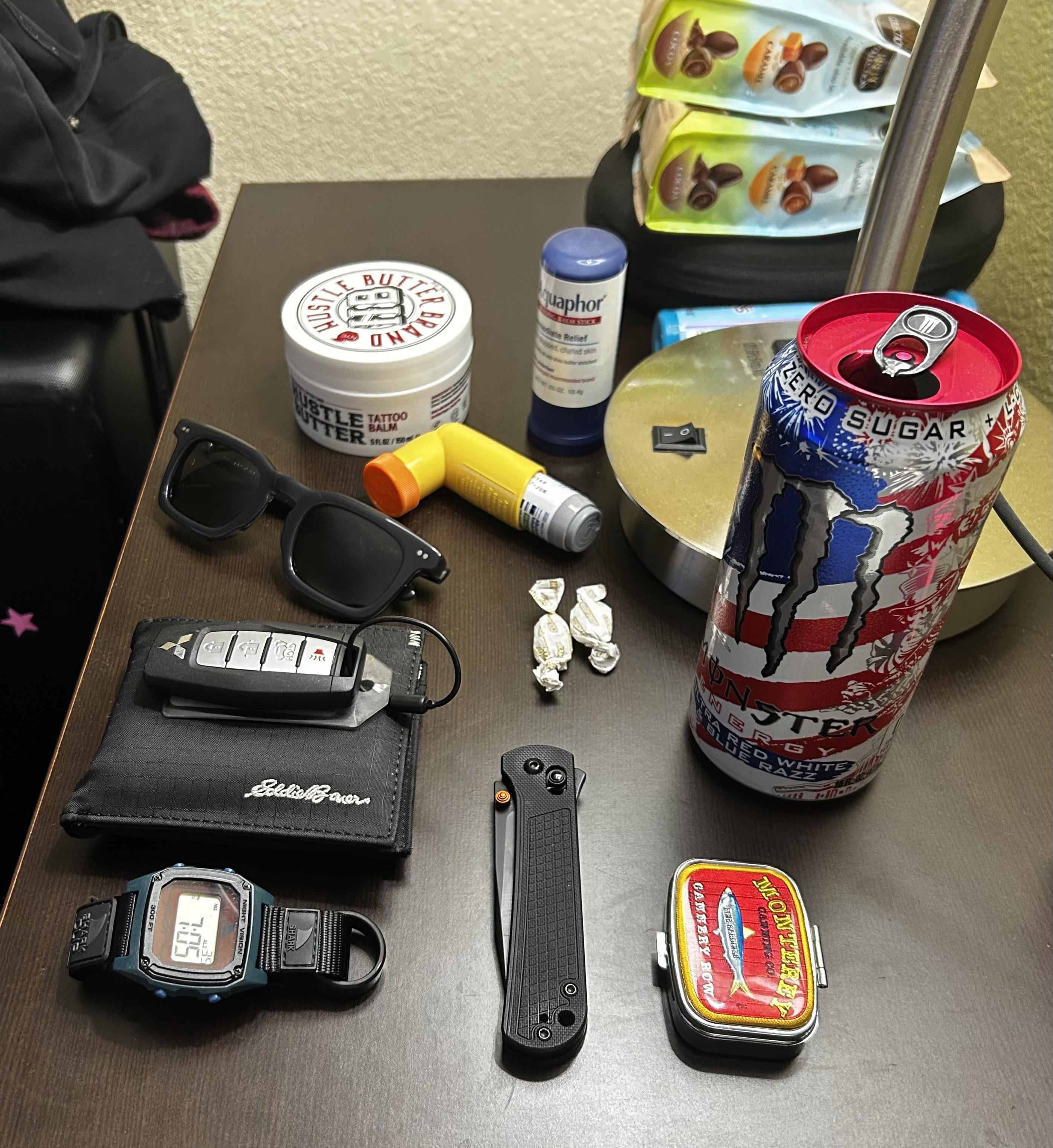 Hustle Butter, Aquaphor, inhaler, cough drops, Crap Eyewear sunglasses, Eddie Bauer wallet, car key, Freestyle watch, Ridge wedding ring, CJRB Blot knife, Monterey pill case, Monster Energy, Sony MX4 headphones, and some chocolate.