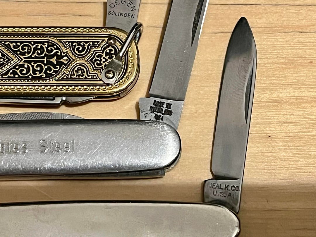 Three vintage pen knives, one Case XX, one German Degen, and a deal k.