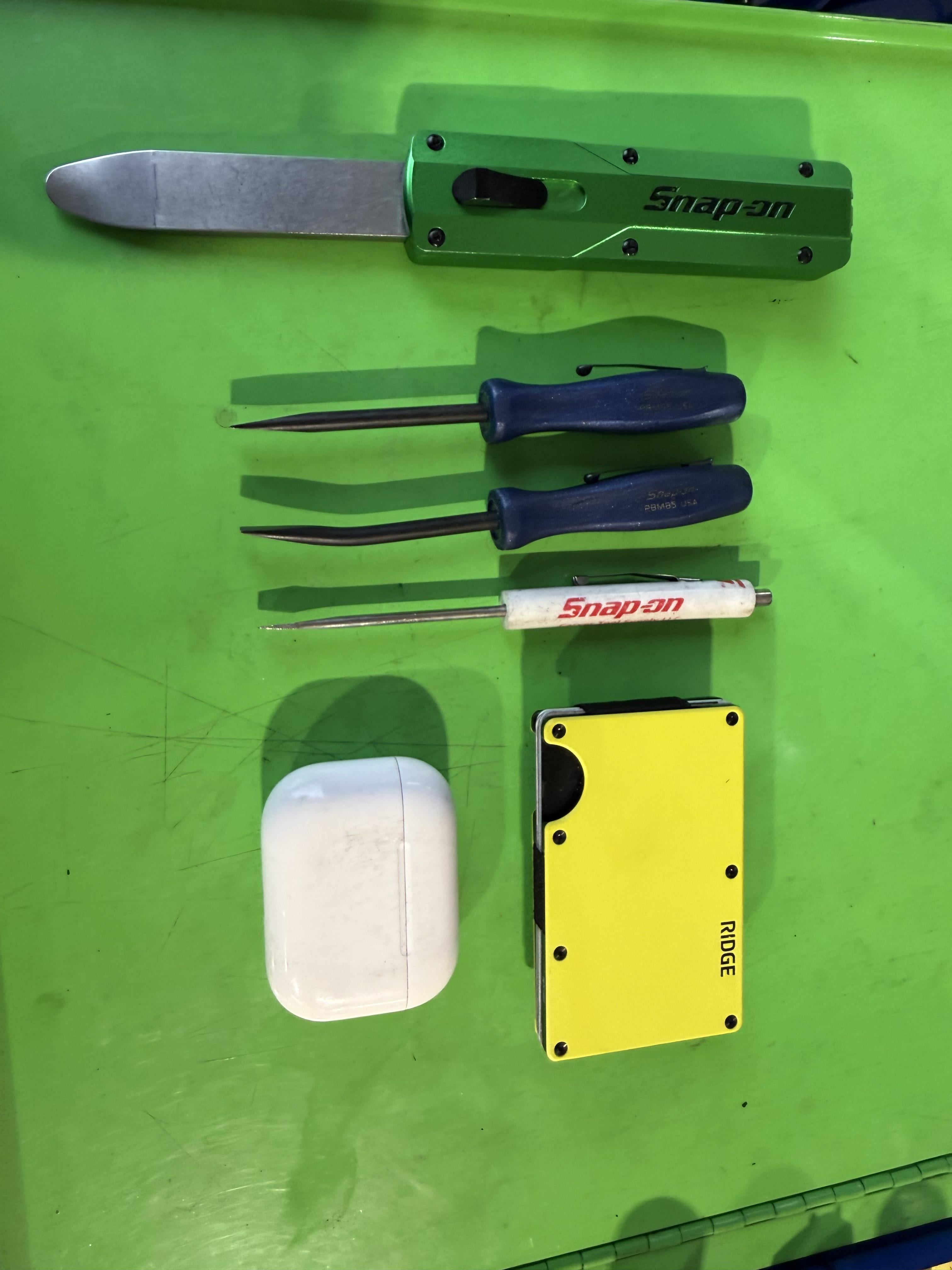 Snap on pocket pry bars (the blue ones), snap on retractable pry bar, small flat head, ridge wallet, and AirPod pro 3’s