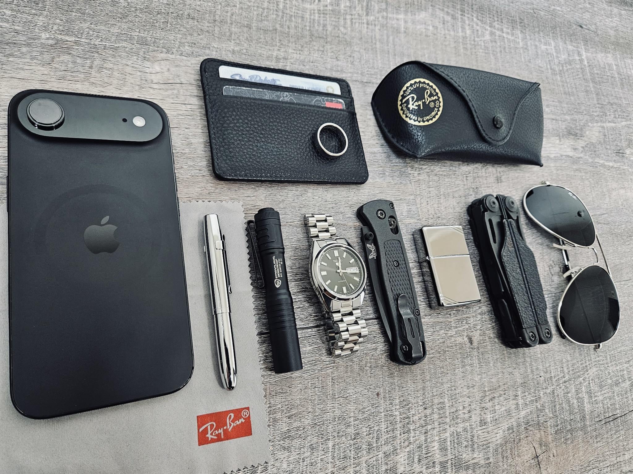 iPhone Air // Fisher Space Pen // Streamlight Microstream// Seiko SNXS79 // Benchmade Bugout // Zippo // Leatherman Surge // Ray Ban Aviators // Wallet + Ring