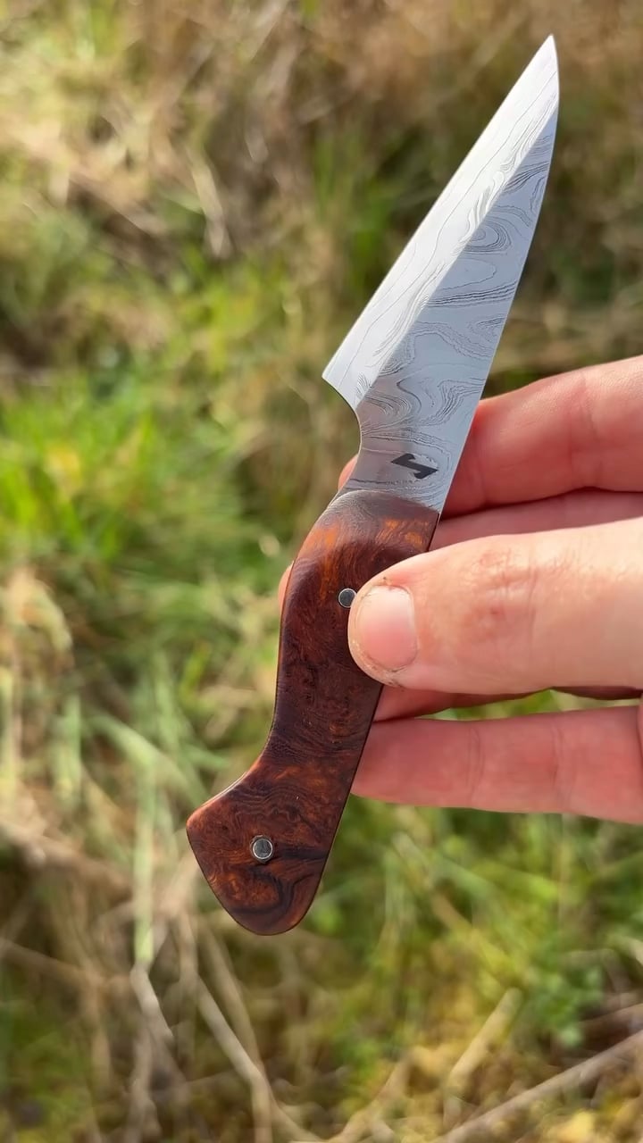 The knife is made of 1075 and 15N20 with a desert/sand-like pattern, the handle uses a piece of desert ironwood burl. The two are kept together with two stainless blind pins. The wide bevel has been ground to a zero edge.