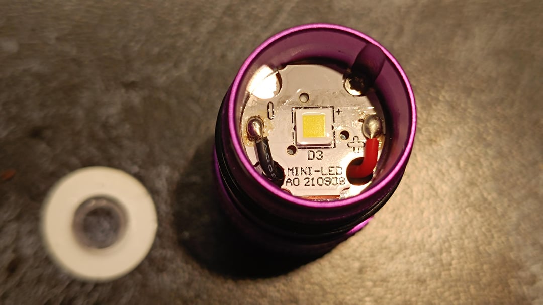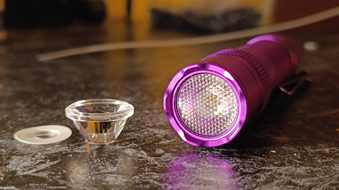 What's wrong with it? Mainly, the emitter. Cold, green, low CRI. As it is 3535 I plan to swap it for 519a. My light also had significant misalignment of TIR and emitter which caused asymmetrical and ringy hotspot (refunded half of its price for this issue). For now I put Convoy 17mm 45° TIR into it, but will try 20° and 30° lens when they come. 45° lens made the beam much better, but I would prefer it to be a bit tighter. Threads were glued, but that wasn't a big problem. Anodizing is shit and scrapes off just by rotation of the clip. Last one is the switch. I don't like forward clickies and will swap it to Convoy reverse one.