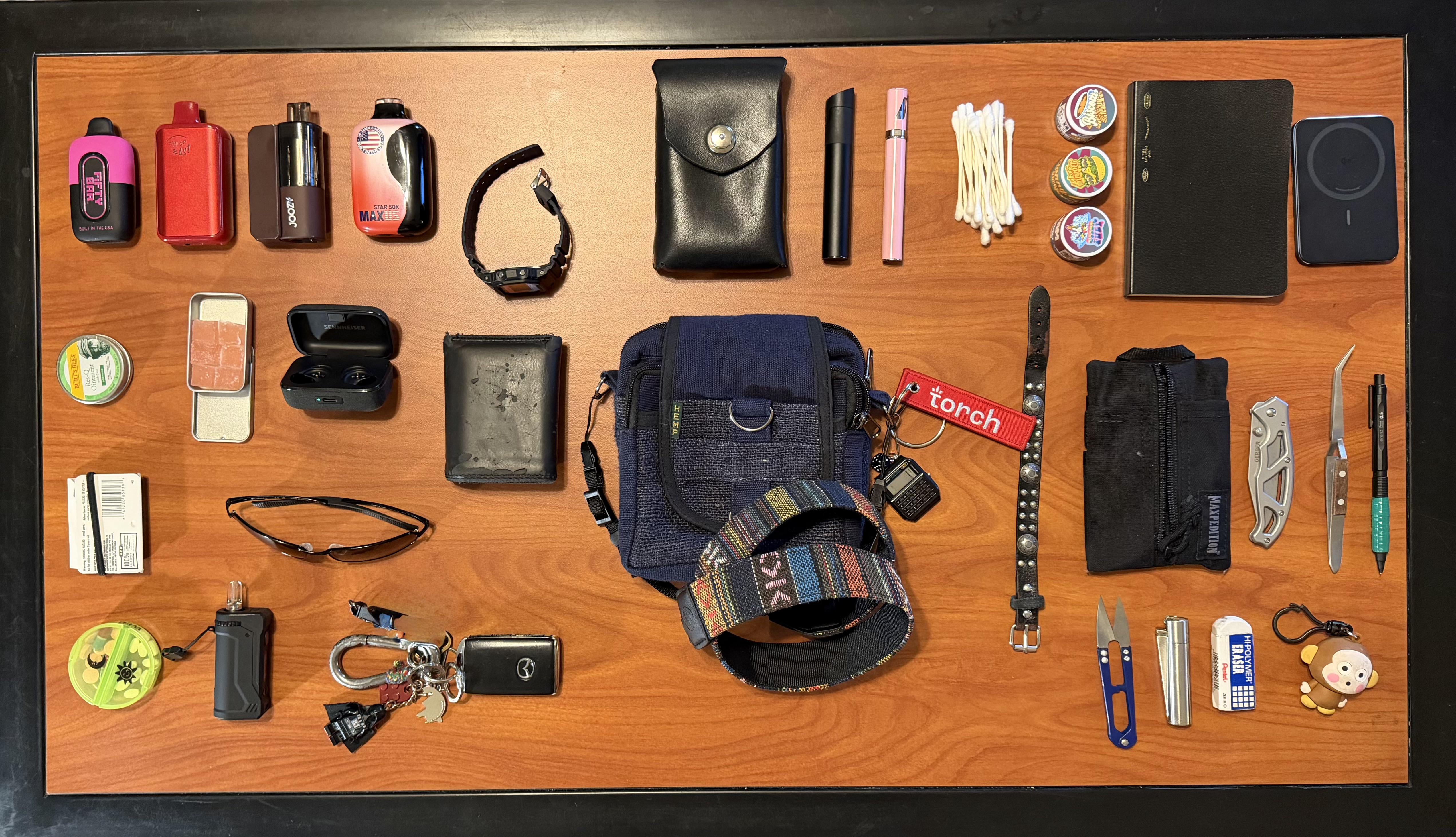 This has become my daily driver and I finally got to finish it out today. – 4x Vapes of various types – Gshock the Lady got me – Leather pouch from Renaissance Fair – Puffco Piviot – Random Hotknife – 3x Rosins Of Various Flavors – Daily Planner – Anker MagSafe Charger – Bert’s Bees Hand Cream – CBD Gummies – Sennheiser Momentum 4s – Random Leather Wallet – Hemp Bag – Random Bracelet from a friend years ago – Maxpedition pouch – Random Knife – Tweezers – Drafting Pencil (Another Gift) – Scissors – Lighter -Eraser – Vitamins – CBD Vaporizer – Keys