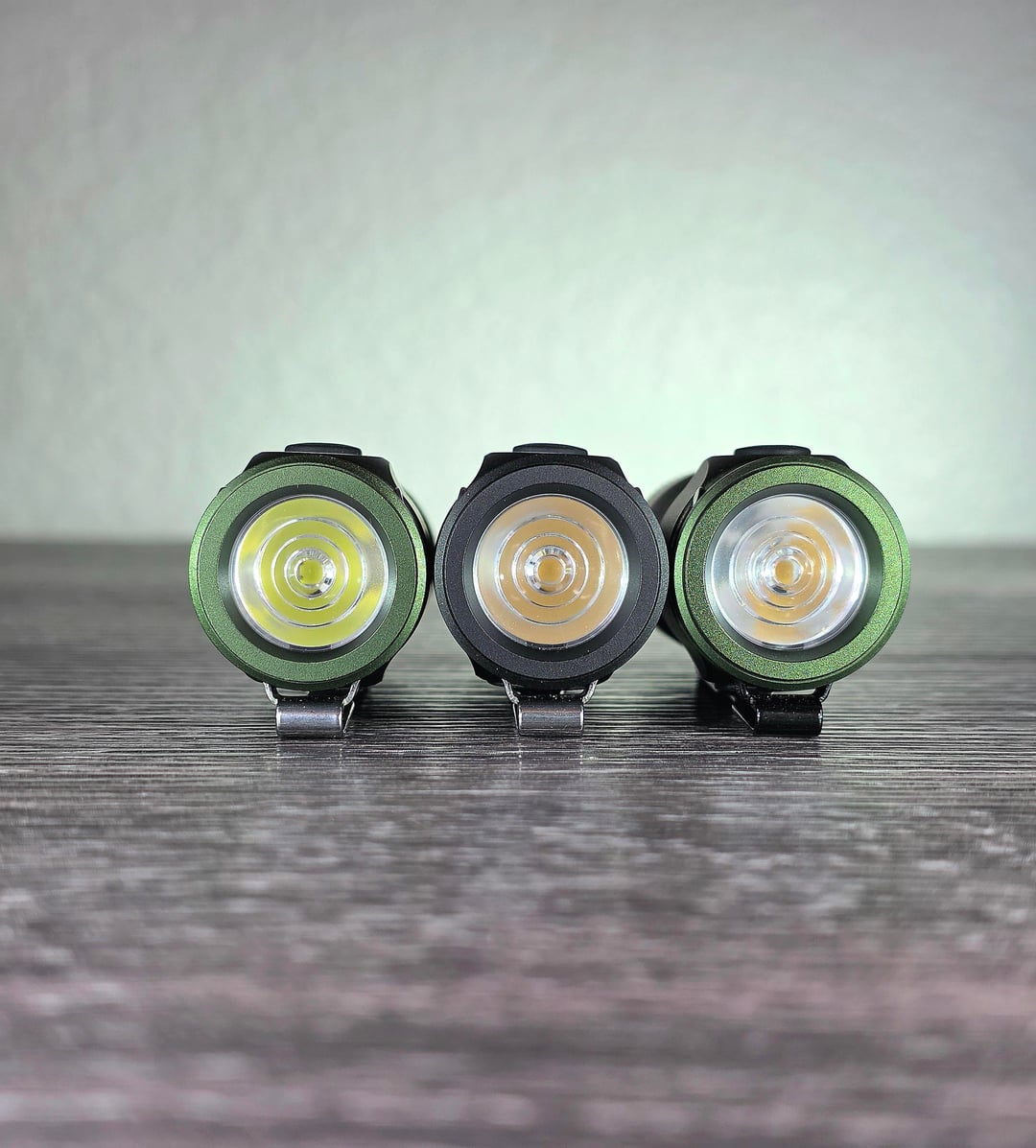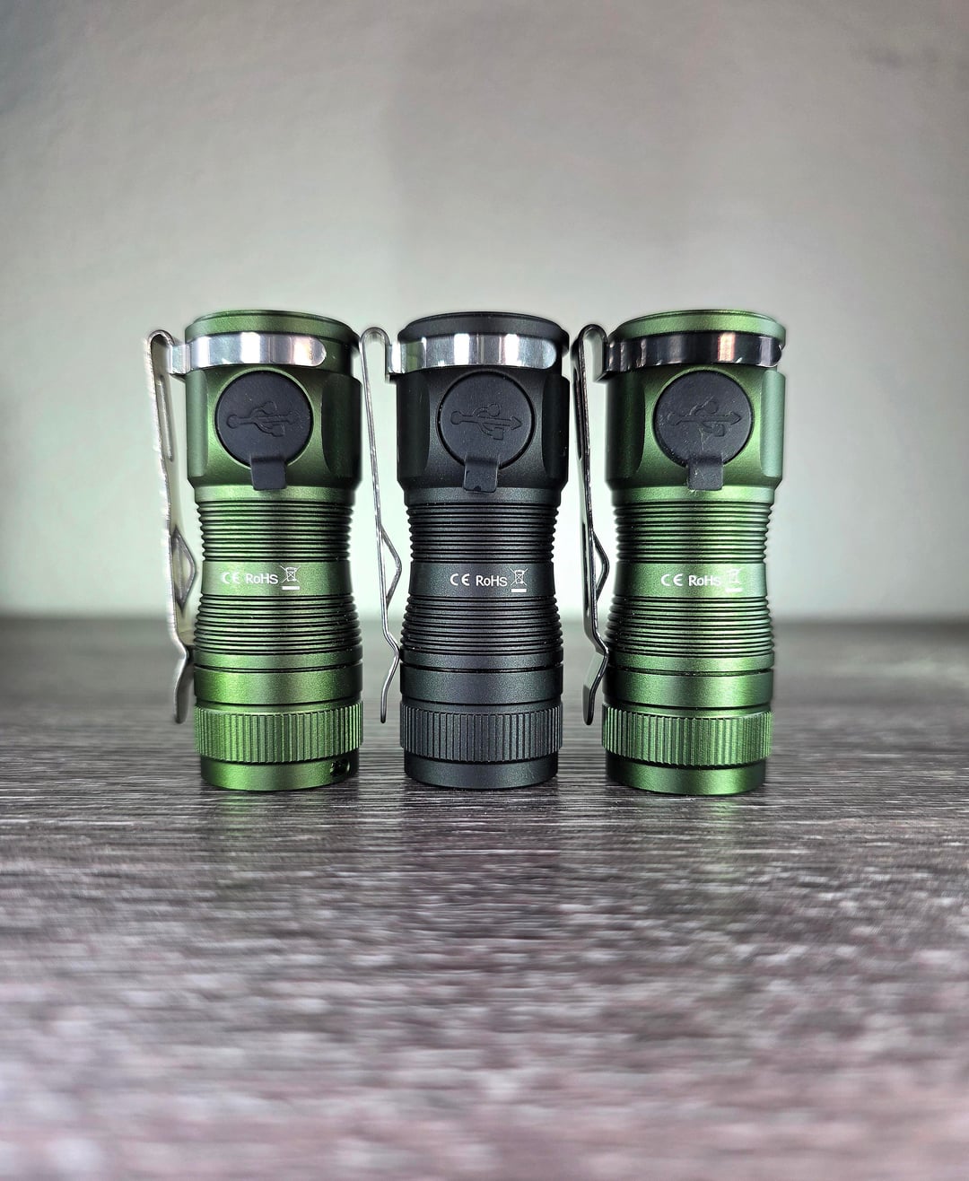 All three come with an 18350 battery and a deep-carry pocket clip. All three also have onboard USB charging and magnetic tail caps.