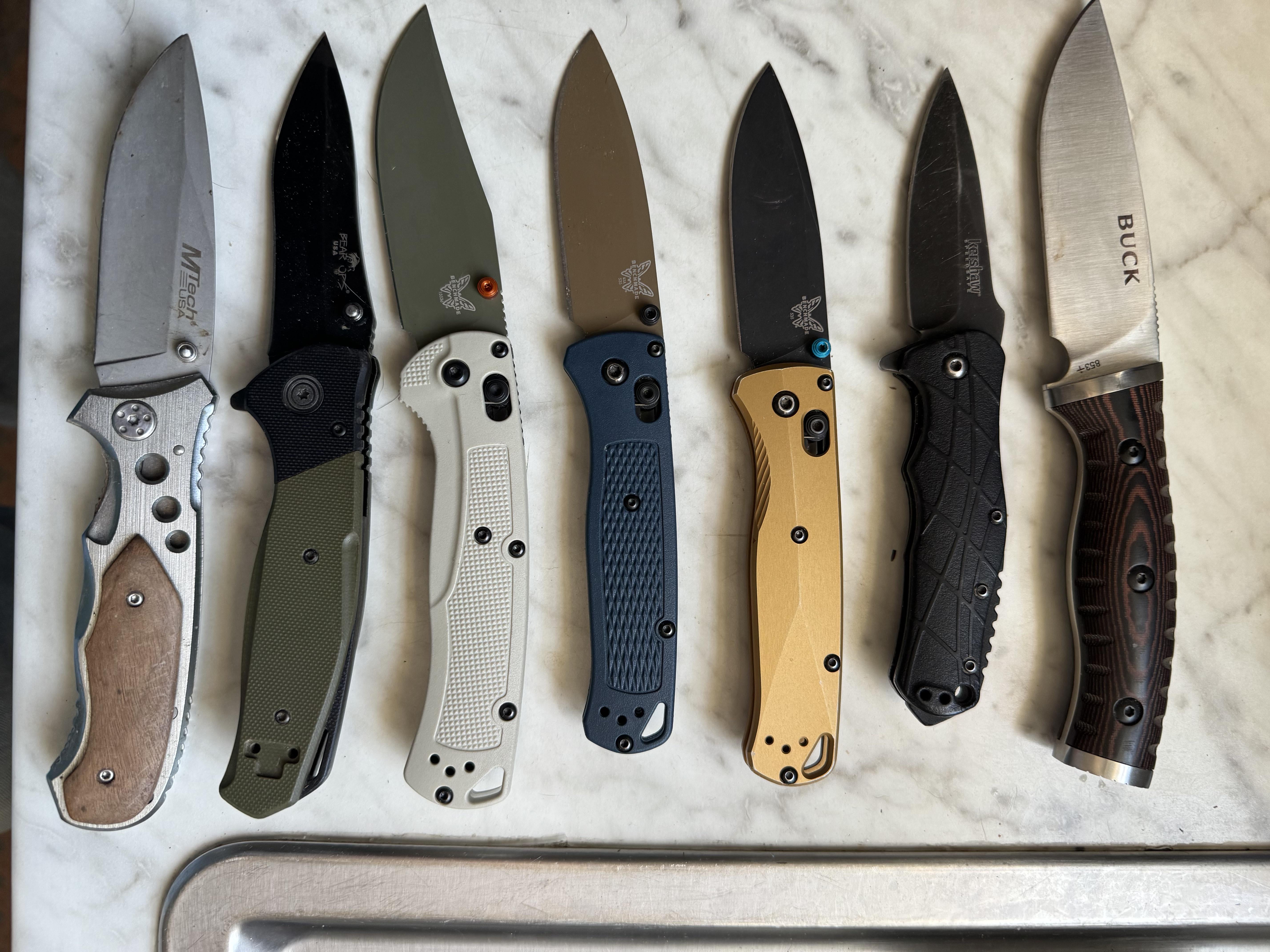 Hey, wanted to introduce myself. I’ve got a few more shitters kicking around somewhere, but this is my normal rotation. I also have a fixed blade bench made that’s in my wife’s car at the moment. I unfortunately stumbled across a bench made Dealer locally that gives 30% off to military. It’s becoming a problem.