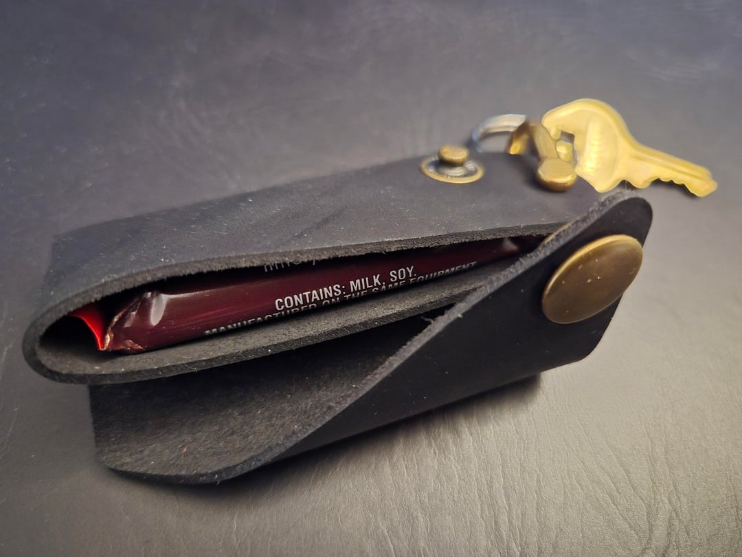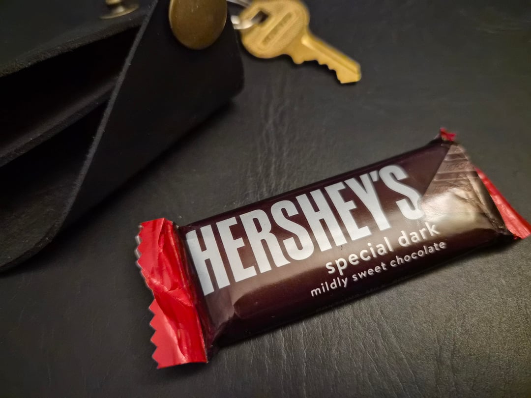 Dark Chocolate Bar hidden in a leather keychain typically used for spare keys, or to reduce jingling. I'm using this to sneak candy around for when I need a little boost in my day at work. I just got this, but I have high hopes for it. And it won't melt in my pocket, my key typically stays in my bag since it's for a locker