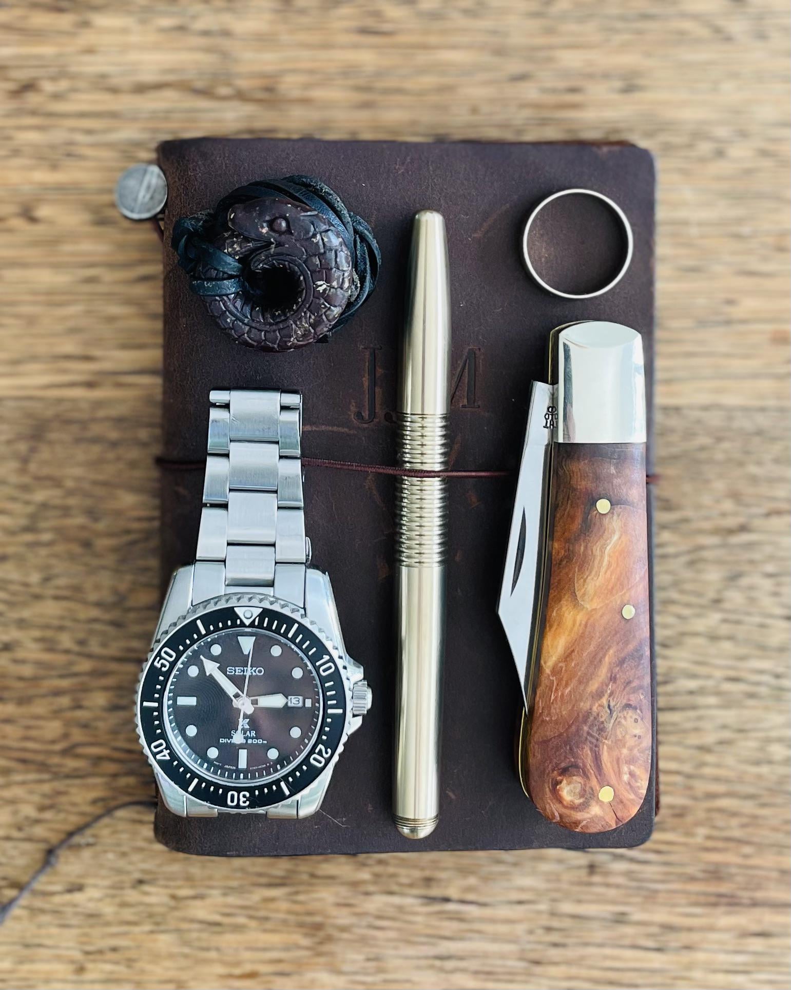 Seiko SNE573P. Machine Era brass pen. Arthur Wright slipjoint. Ouroboros pendant on leather necklace. Wedding ring. Traveler’s Company notebook.
