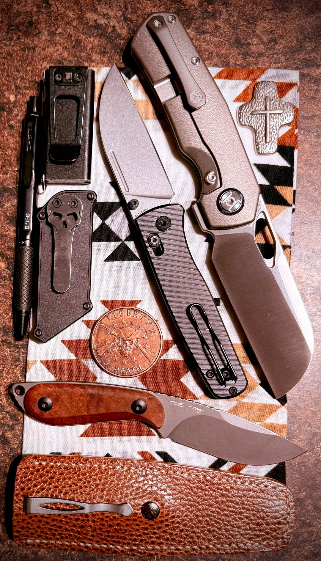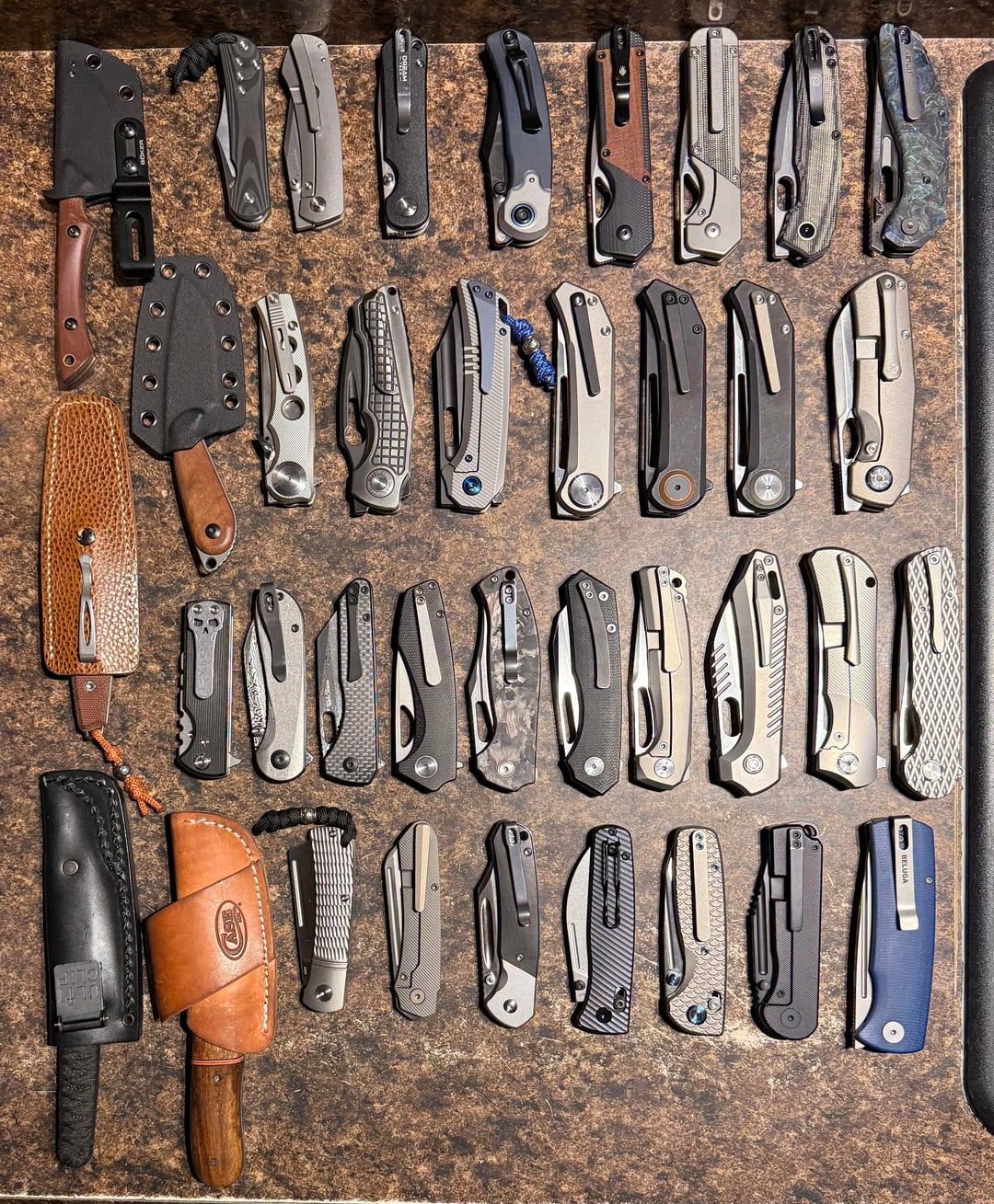 My five pocketable fixies on the left; then all of my knives with fullers across the bottom (two of which have flippers as well); next row up is all my knives with just classic back flippers; the 🔪’s in the row above that are front & back flippers; and the very top row are the front/top flippers only.