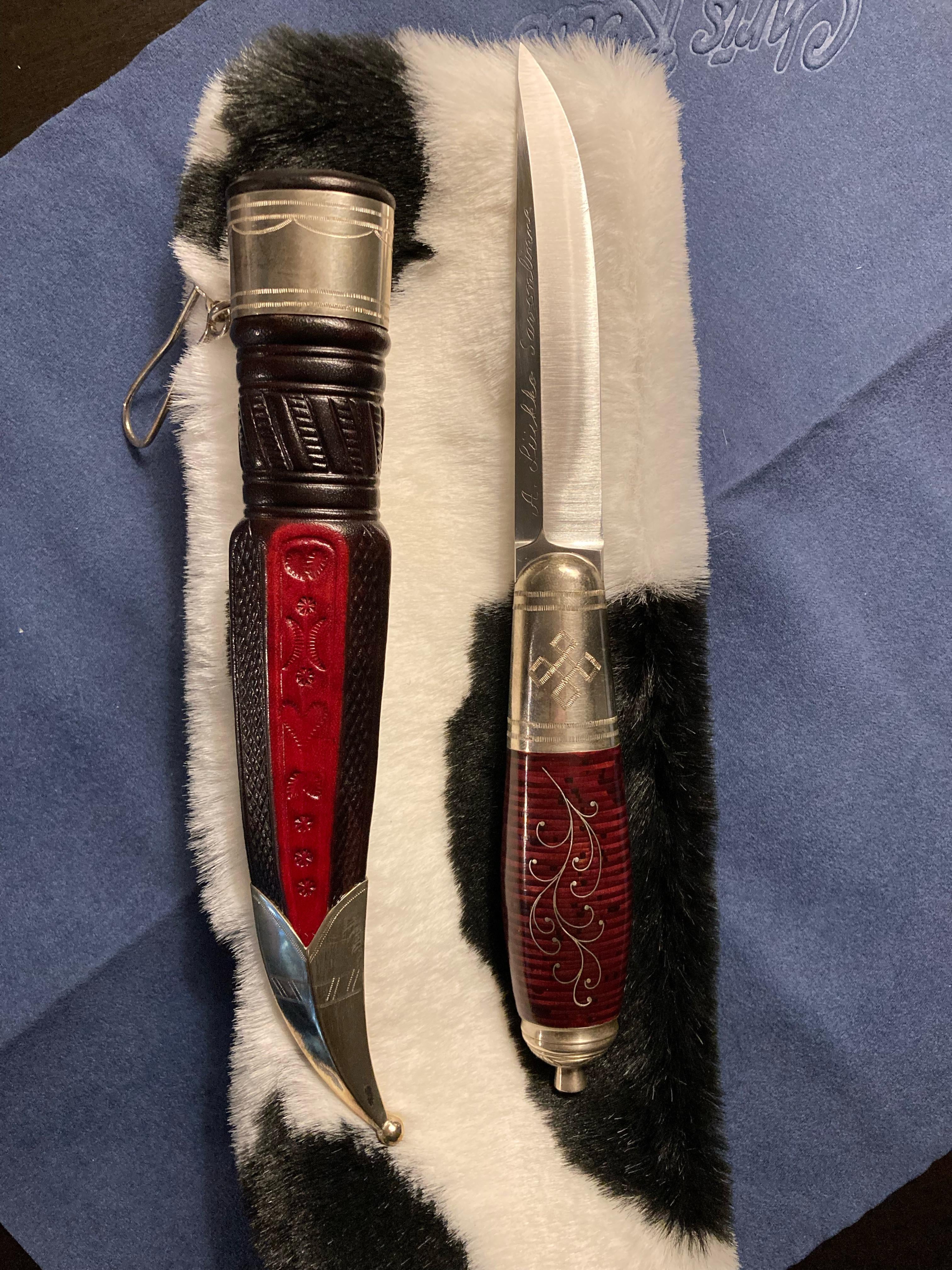 LingonberryAny3009 4 hours ago A traditional Finnish Rautalampi Puukko made by master bladesmith (puukkoseppämestari) Arto Liukko. This one has dyed birch bark for the handle, a lily of the valley engraving, and a decorative leather sheath.