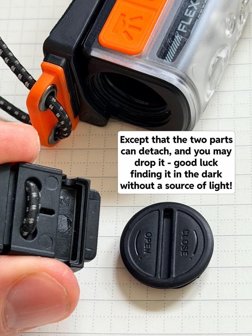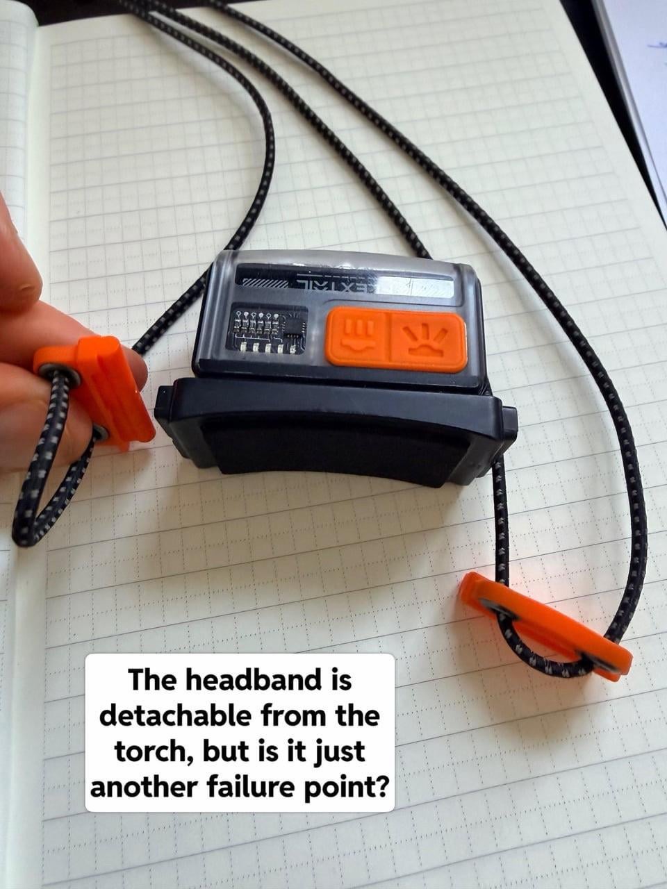 * There are number of failure points on it. The headband mechanism is detachable from the head torch, but it only adds another failure point without any benefit.