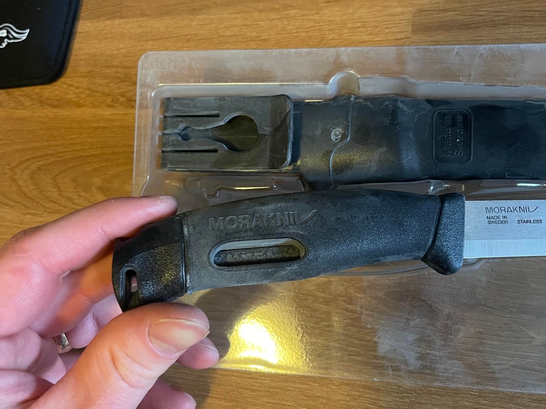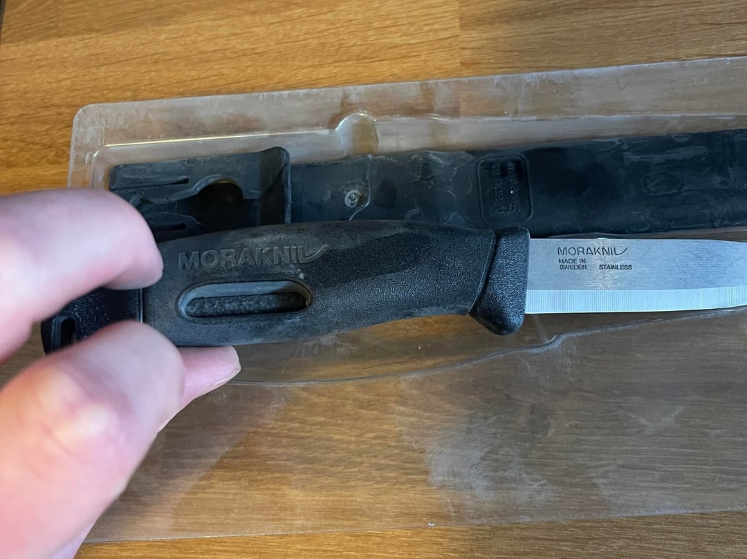 Just bought a Morakniv Companion Spark, and the knife and the whole inside of the package is covered in this dusty powder. Third pic shows what it looks like when I wiped a section clean.