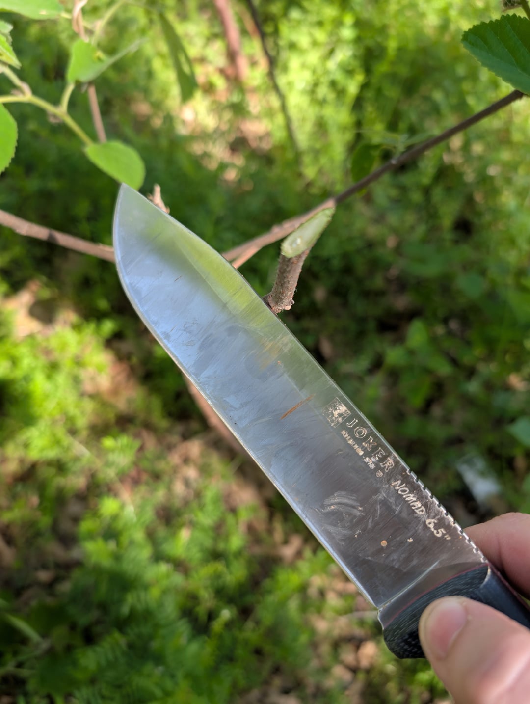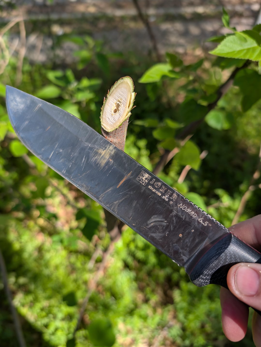The steel is Bohler N695. I know the common discourse on this steel is often not all that positive but I have never really seen anything to complain about with this steel. I highly doubt something like Magnacut (great general purpose alloy for knives) or one of the other newer powder stainless alloyes would make all THAT much of a difference. Having used the hundred/thousands of knives and god knows howany steels over the past two or so decades, the statements from folks like Roman Landes and Cliff Stamp really do hit the nail on the head about people's undue focus often times on one steel over the other. Not that particular alloys or classes of alloys can't have their benefits, but by and large, all else being equal, it's nigh impossible to definitely tell on steel from another in actual use. Maybe you can notice it when comparing steels of wildly different alloys like 52100 vs S90V cutting rope on a draw cut. But beyond that, people make far too much ado about the specific steels. Joker seems to do a very solid and functional heat treat on all the steels I have used by them.