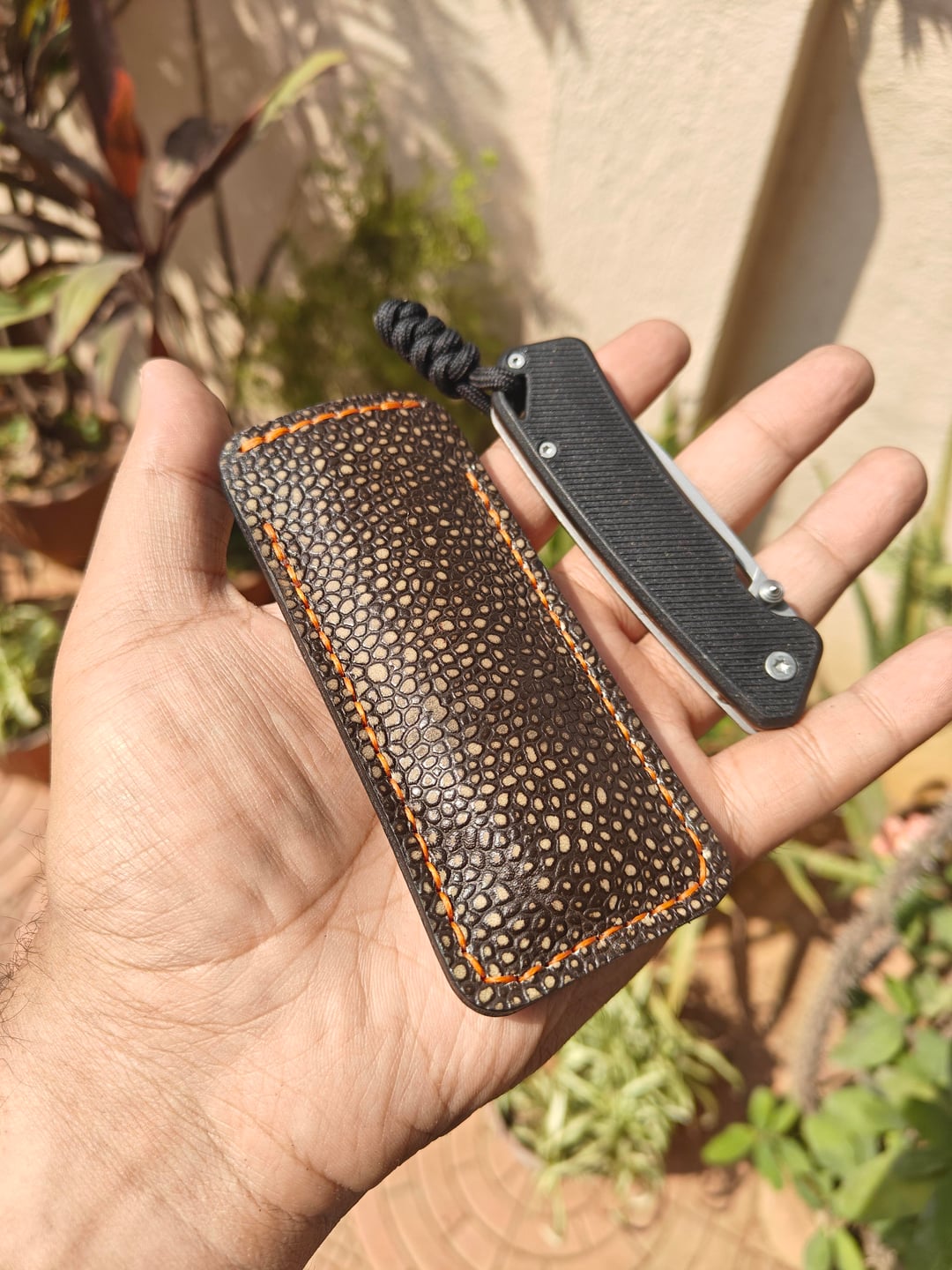 Hand stitched with 0.8 mm ritza thread in orange to match the orange liner