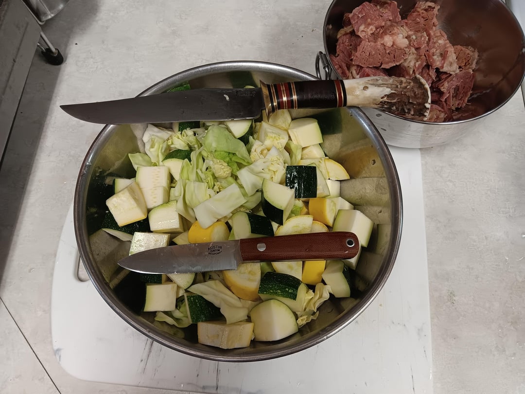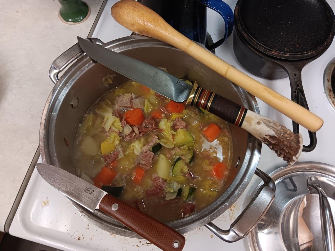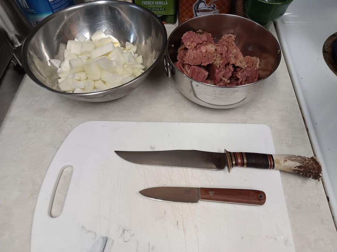 The Scagel carving knife was made by Dave Shirley in 2005. He owned the Scagel brand at the time. Joel Austin made me this custom EDC pairing knife. They made quick work of all the cutting today.