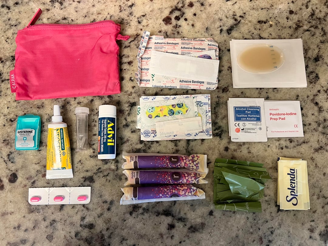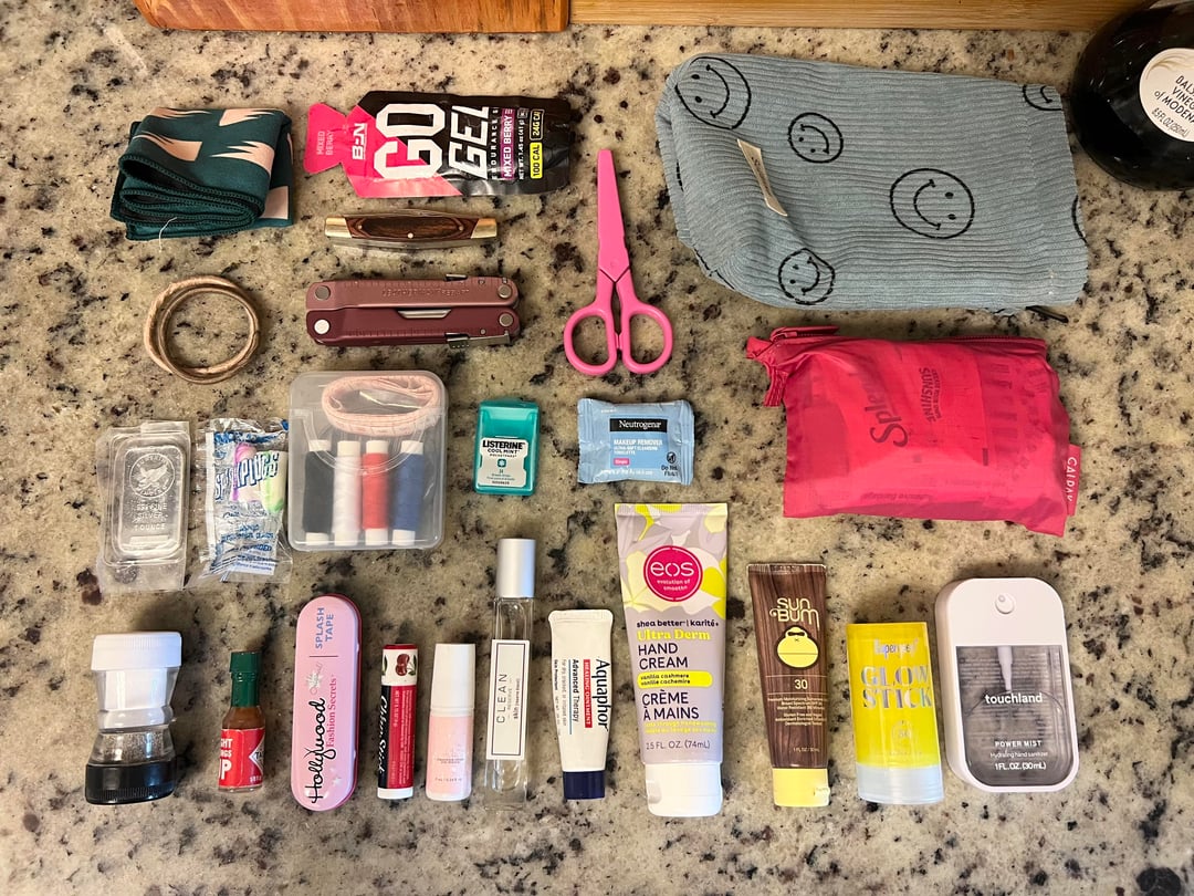 – Okay. So my “probably don’t needs”. The silver, obviously. But my MIL is Sicilian and demands I carry it with me everywhere. Honestly, I’ve had good luck in my life so at this point I’d be worried about leaving it behind! Then the GU pack. My mom is type 1 diabetic, and I’ve only once been out with her where she didn’t have some sugar tabs or candy and this was ESSENTIALLY to keeping her conscious. I can’t leave without it, even though she goes out with me only occasionally. Finally, the sewing kit. There’s been a handful of times I’ve needed to sew a garment in a pinch, but everytime it’s been a serious need haha. It’s worth the extra space for the few occasions I have to fix a tear or a hem. The buck knife + leatherman is redundant, so I’ll probably stop carrying the buck knife eventually. It makes me think of my dad though, so I’ve kept it❤️