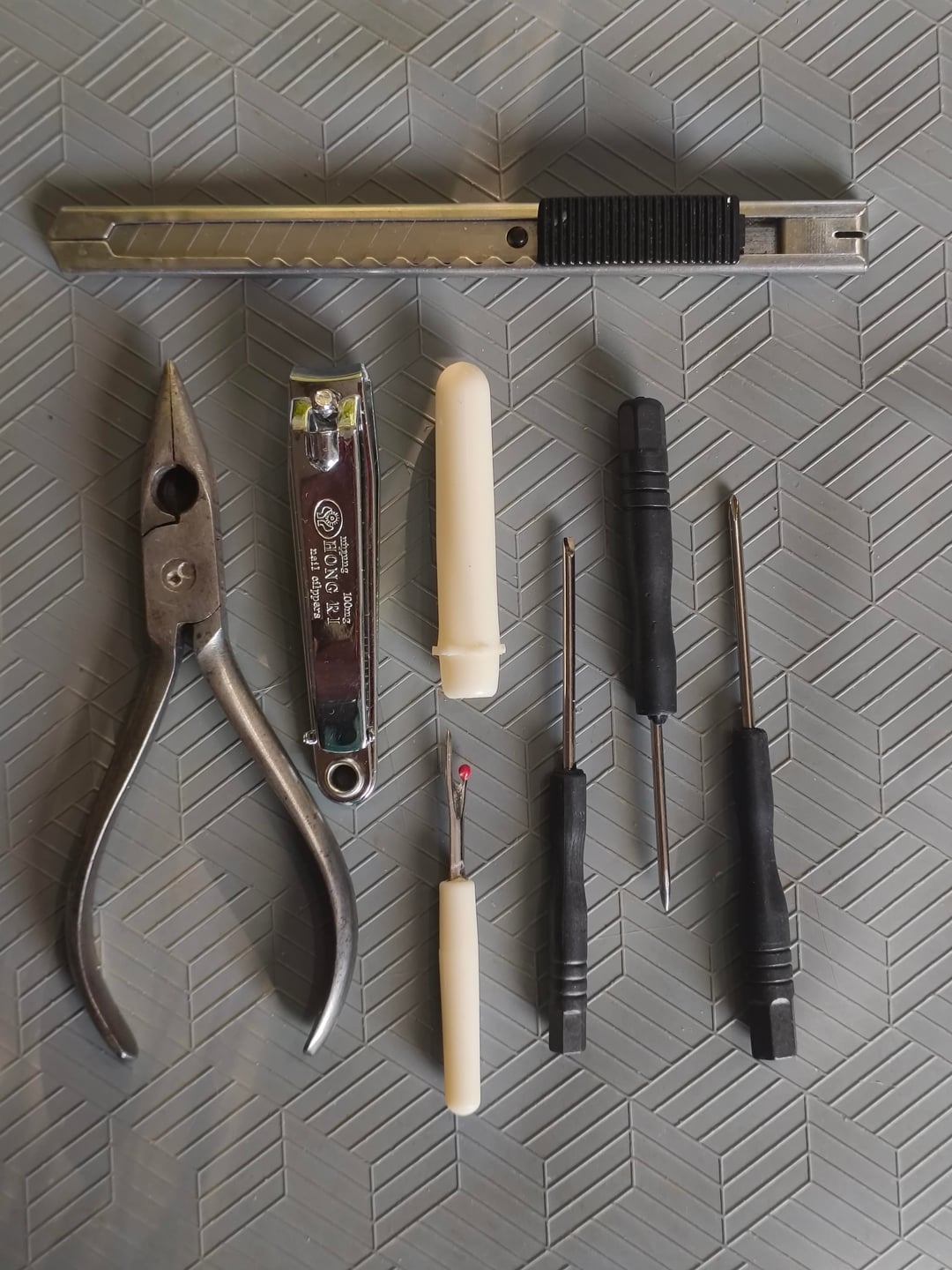 • His: fine pliers, clipper, scalpel, tool to undo sutures, small screwdriver set (philips, flat, awl)
