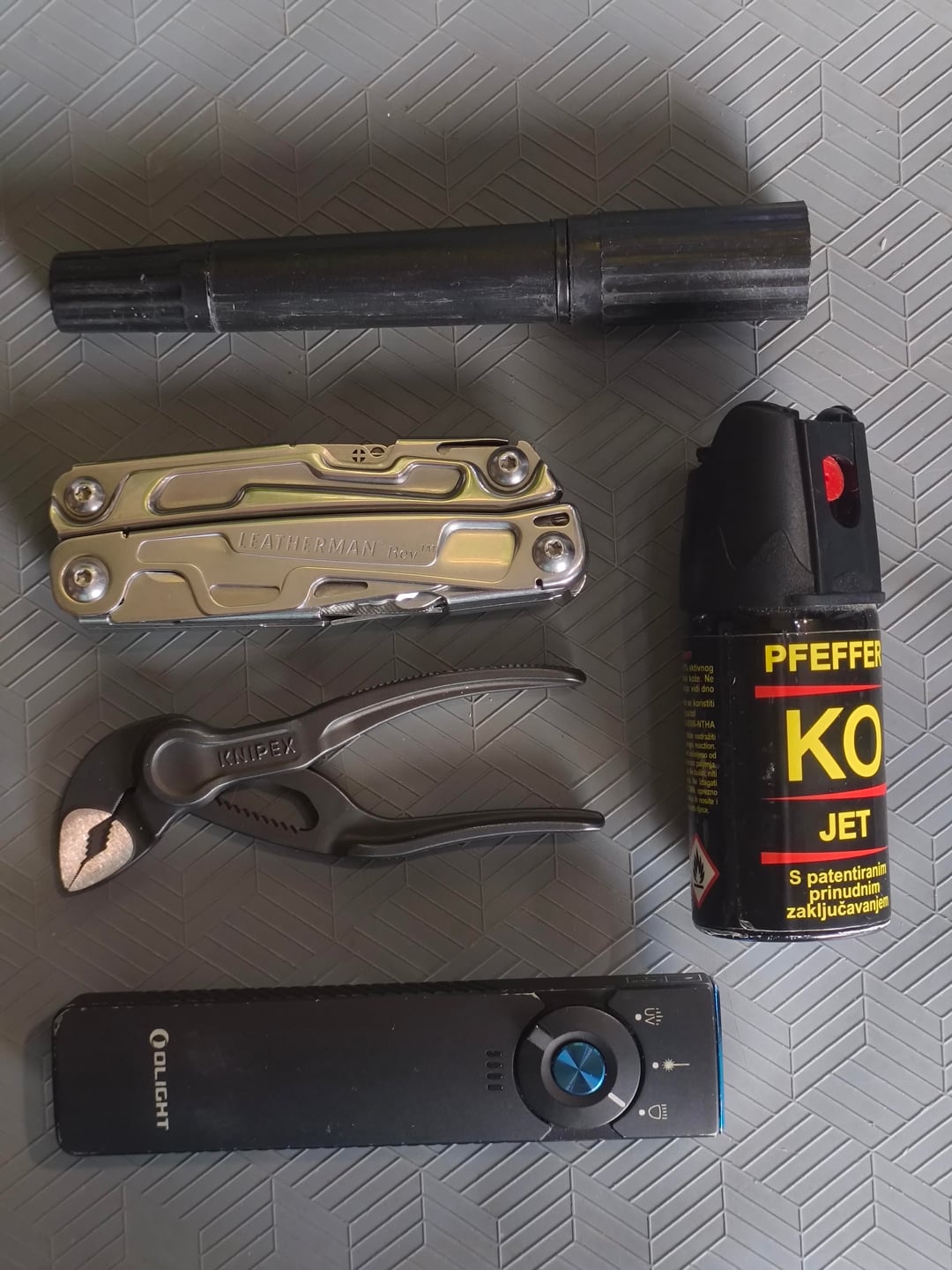 • Mine: double tipped marker, leatherman rev (with scissors), knipex cobra xs, olight arkfeld pro, pepper spray