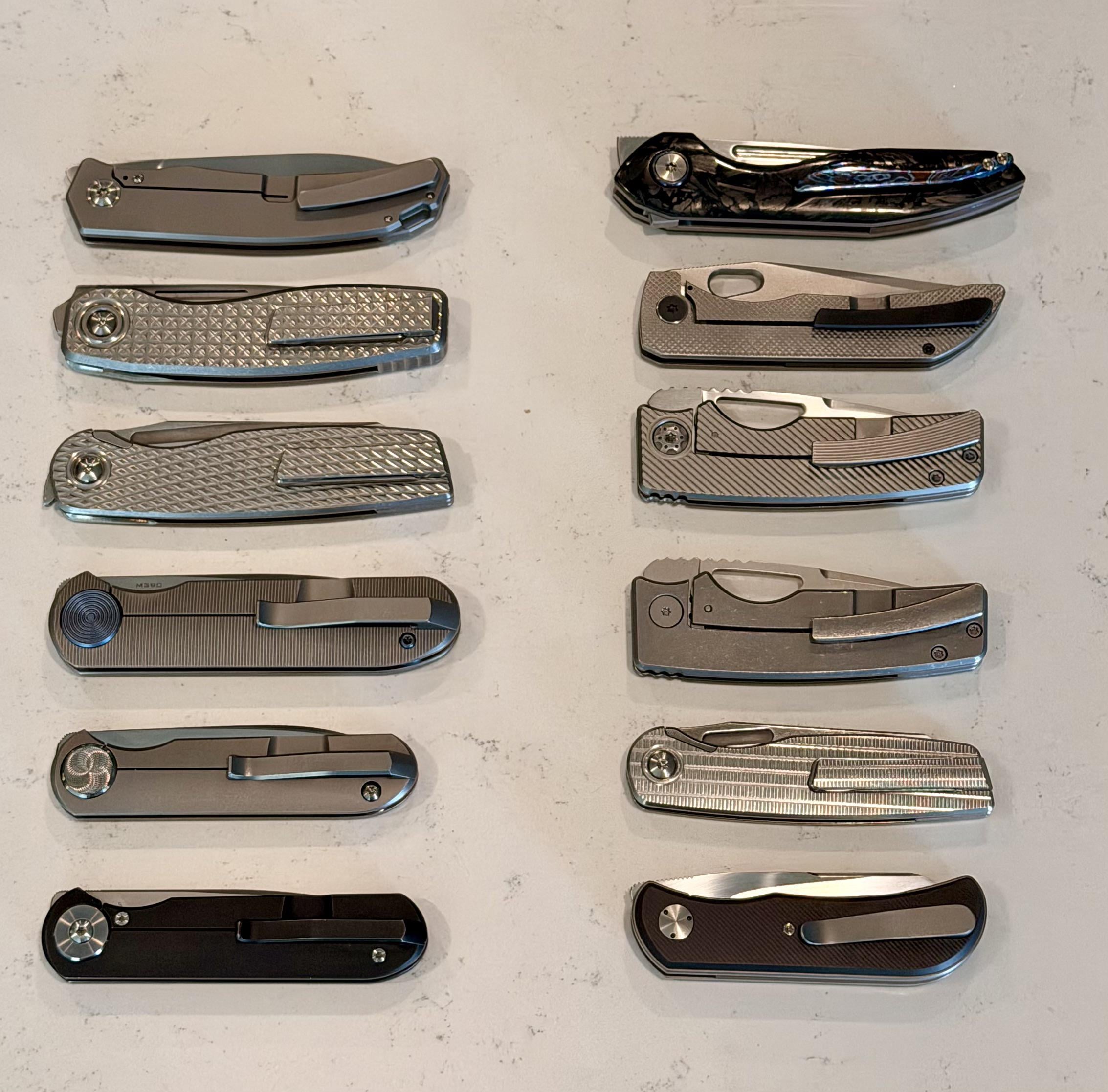 About half of these gotta go. Help me choose which to keep and which to sell. Burger Urban XL, Brown Mini FSD-i, Brown Cortex y, Hilberg/Lion Bladeworks 3.3" Sham clone, 3" Bull Sham Spiro pivot, 3" Shamweri, Perlow Upgrayedd, Wehr Snoop, Oz Roosevelt x2. Angle milled is a clone, Brown Cortex Mini, Burger EXK Full Ti recessed build. Half can stay. Half gotta go.